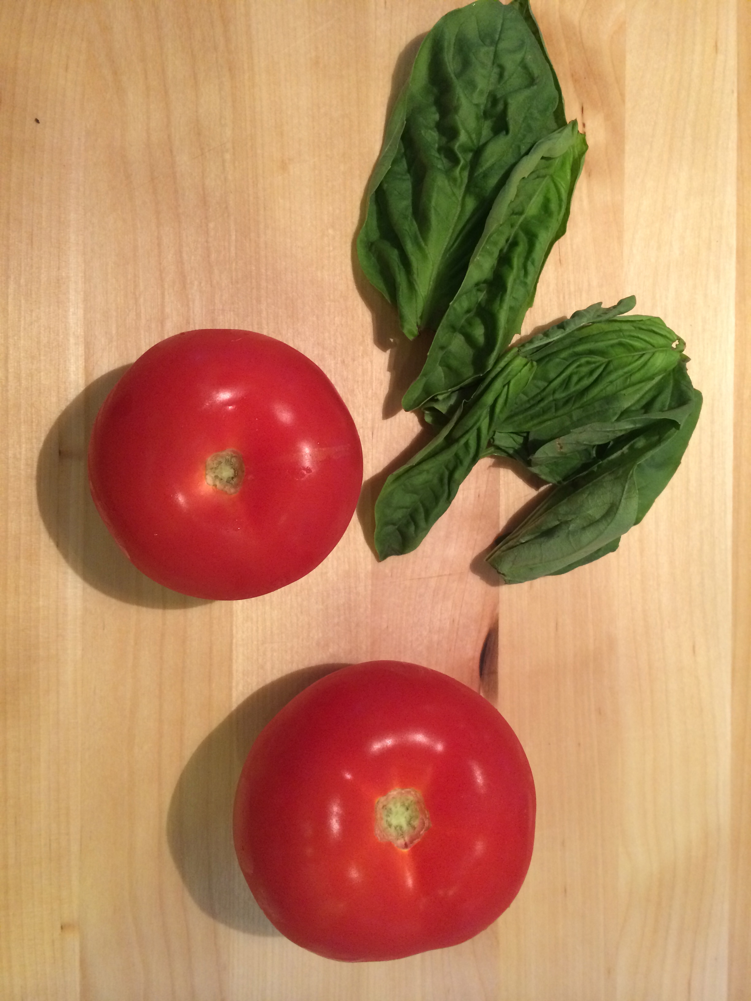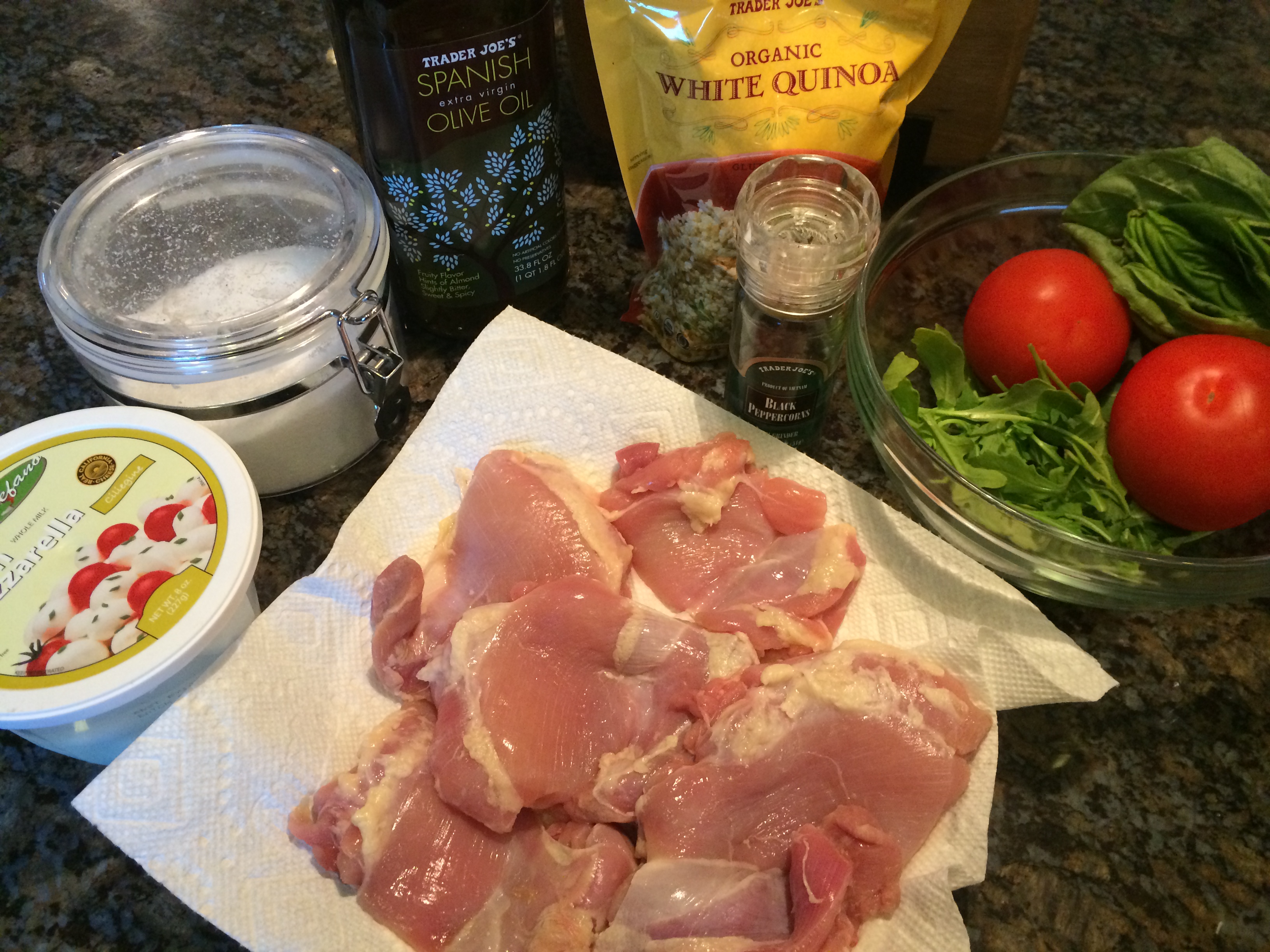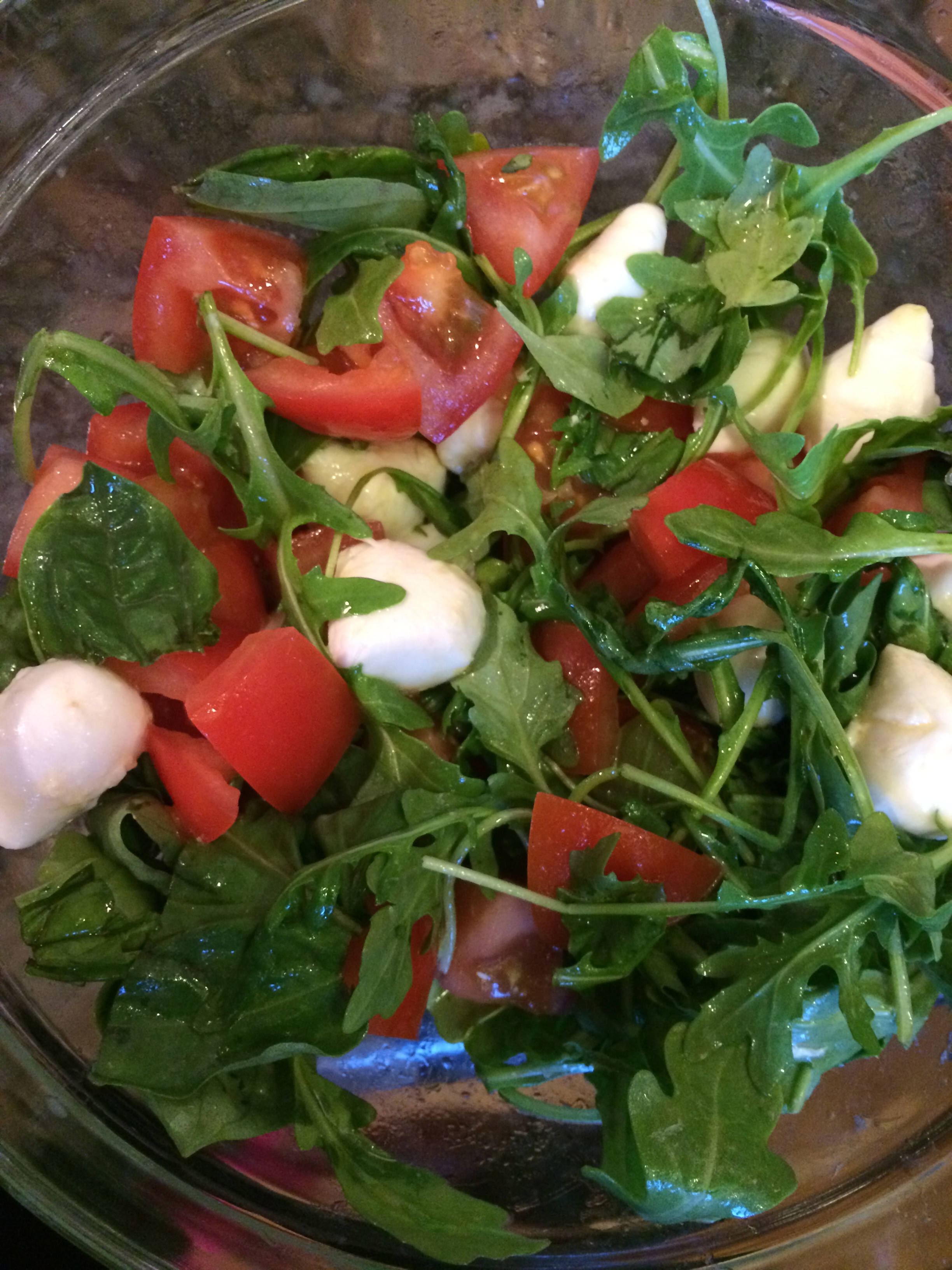 While the thighs are cooling, make the salad. Chop up the tomatoes, and toss with arugula, and some basil (ripped into small pieces), and small balls of mozzarella. You can use any type of mozzarella that you like, but I really like these small fresh balls. They sell them at Whole Foods.