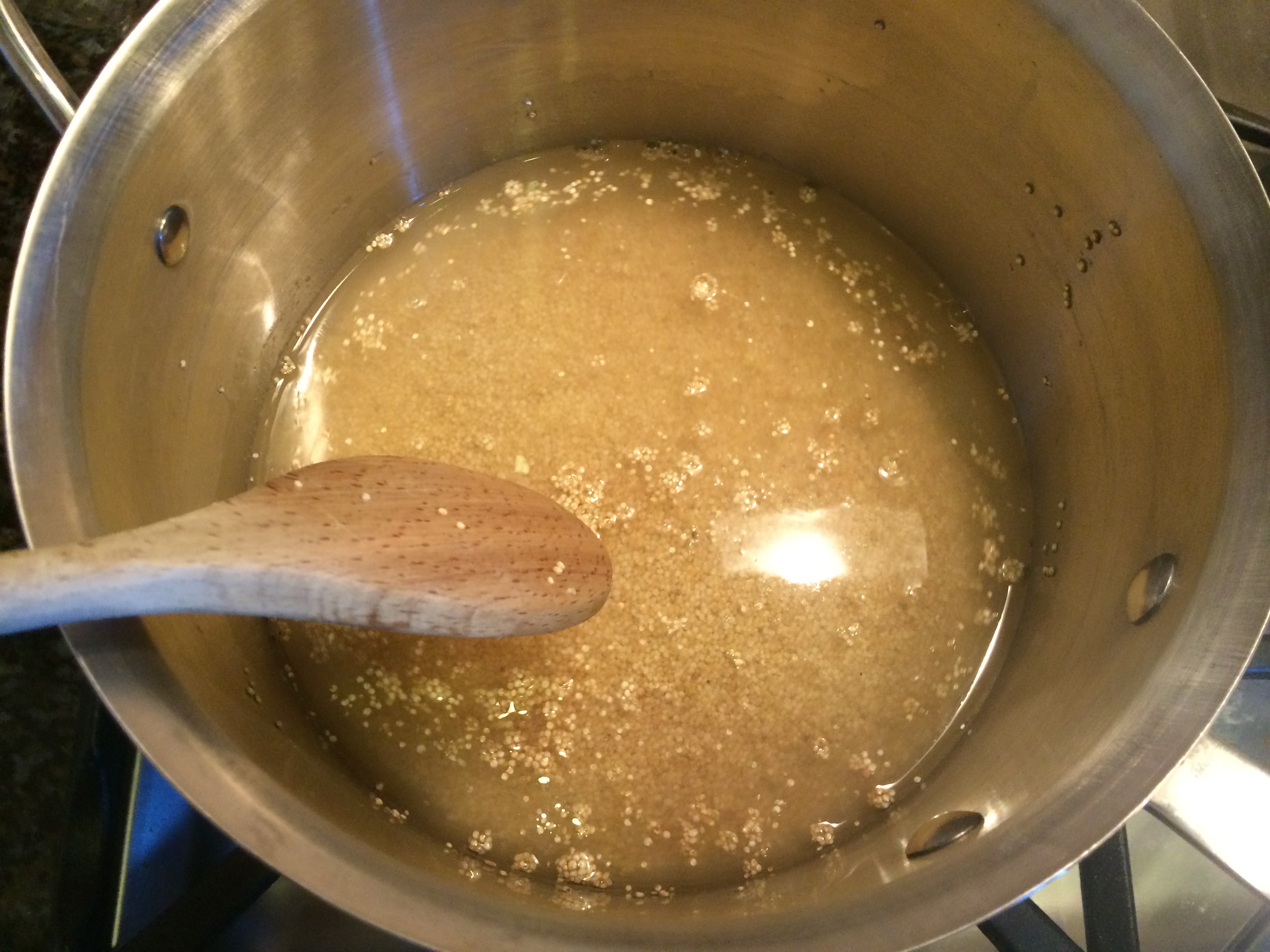 The first thing I do when I make this meal is to start the quinoa, and start preheating the oven to 425 degrees for the chicken. Grains usually take the longest to cook, so you want to get them on the stove top immediately. My quinoa brand (Trader Joes) takes about 15 minutes to cook. It’s very simple — just follow the directions on the box. You add the quinoa, add the water, stir, bring the mixture to a boil, turn down to simmer, cover, and let sit for about 15 minutes.