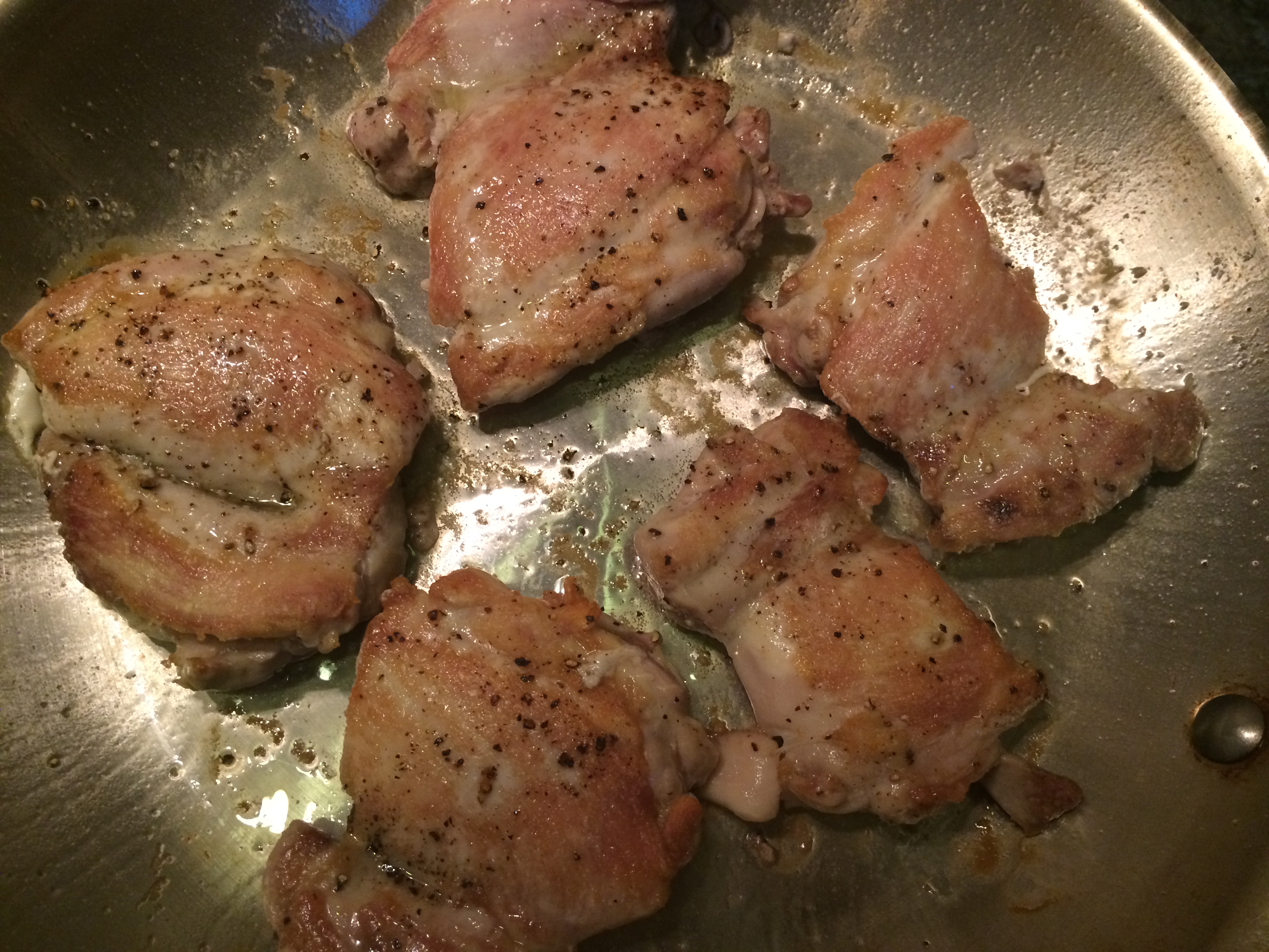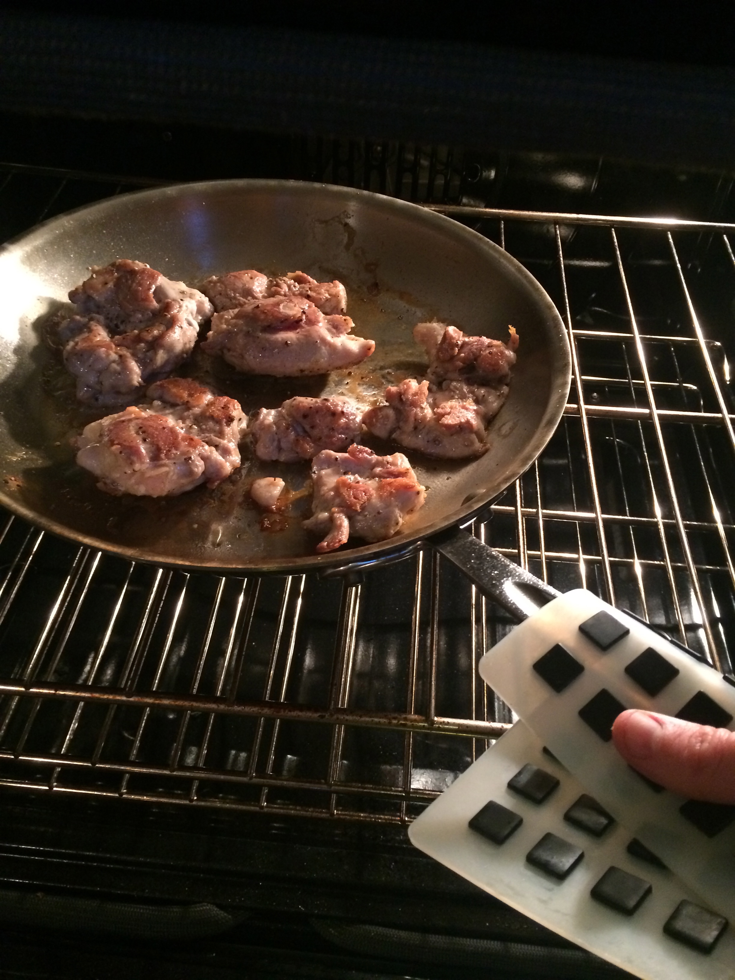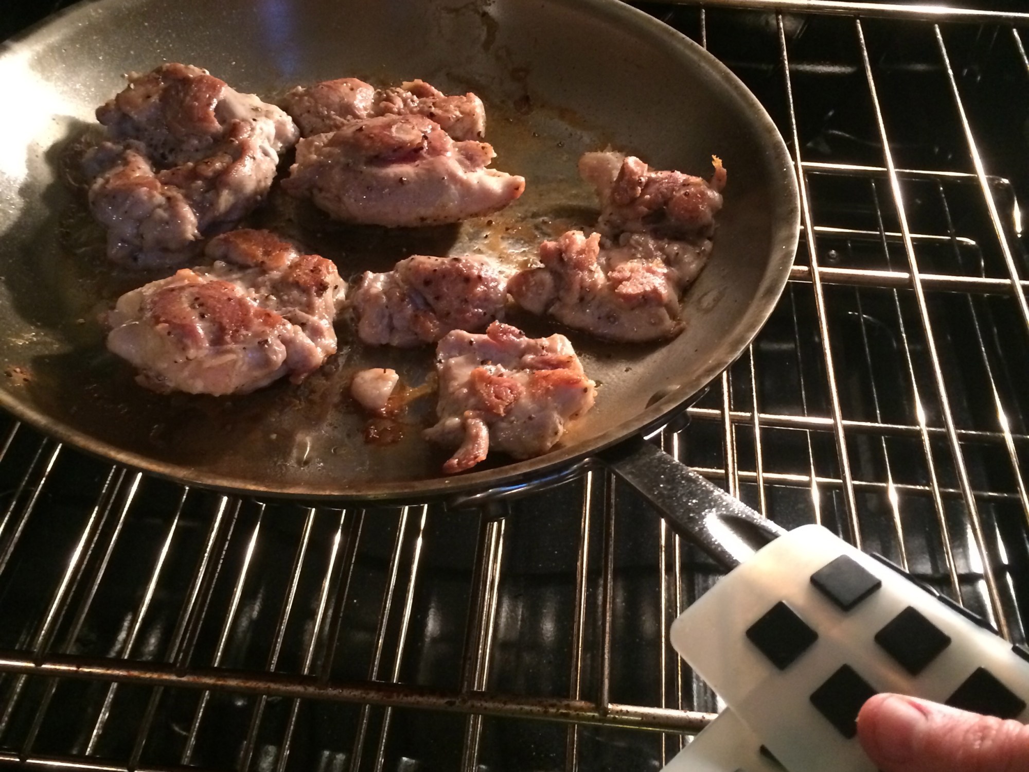 After 4 minutes of browning the thighs on both sides, transfer to the over. Cook 3 minutes, and flip the thighs: