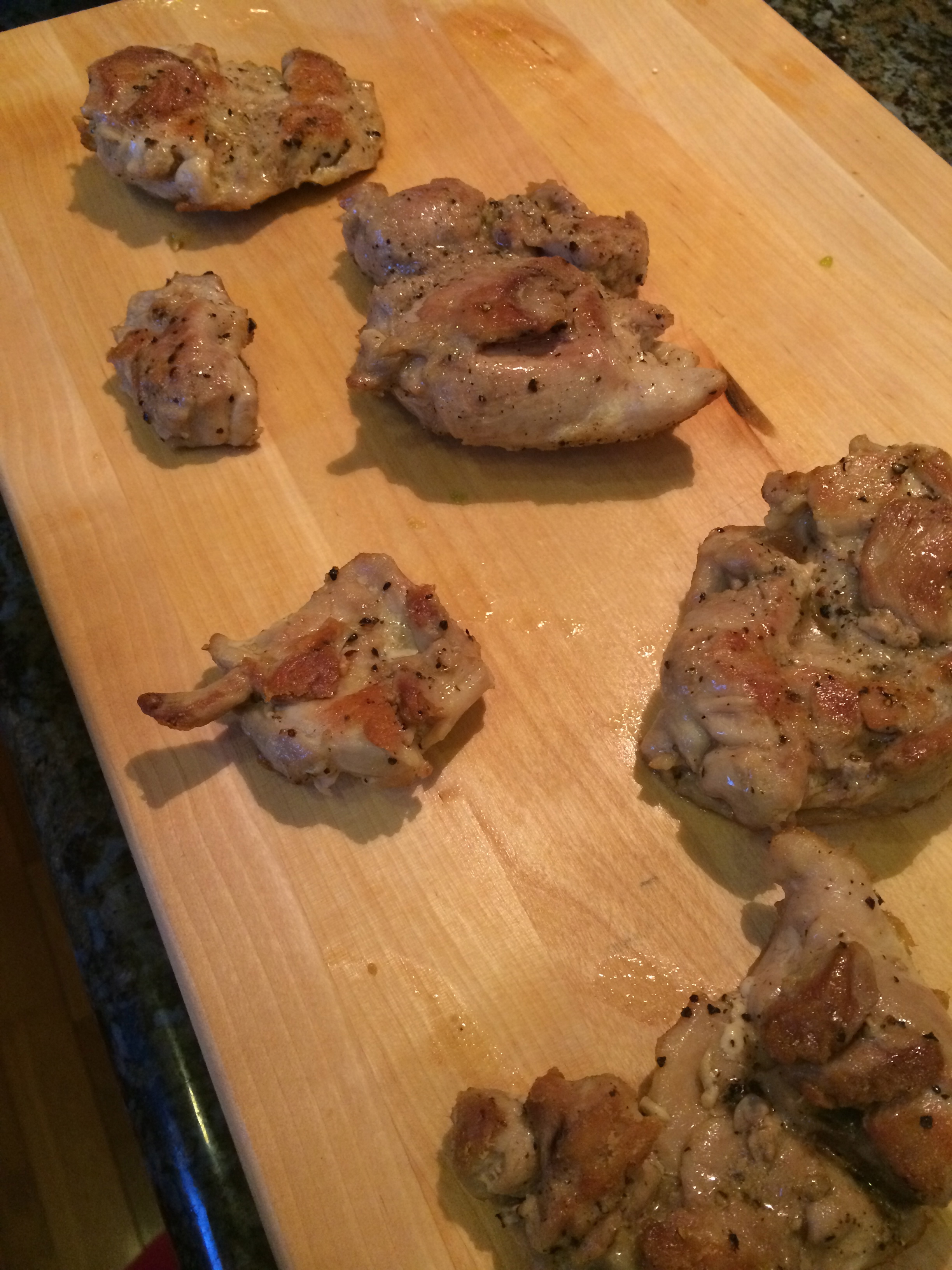 Throw them back in the oven, and given them 3 more minutes. After that, take the thighs out, and transfer them to a cutting board to cool:
