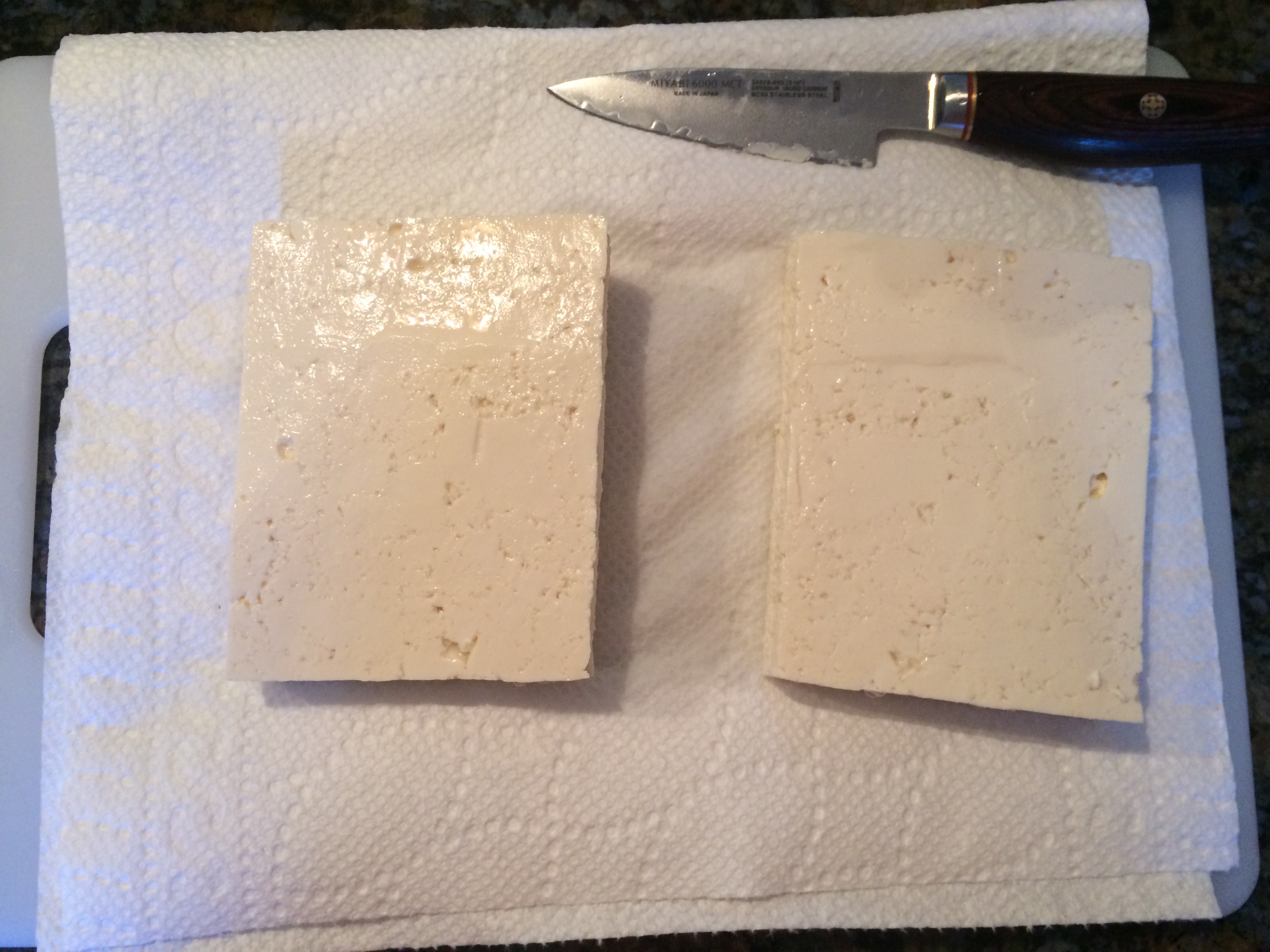 Place the tofu on two paper towels to drain the excess moisture, and cover with two paper towels. Press down. Tofu is spongy, and you want to get as much water out as you can before you fry it. This ensures that the tofu sucks up whatever flavors you’re cooking with. Then, using a knife, cut the brick of tofu into two equal sized pieces.