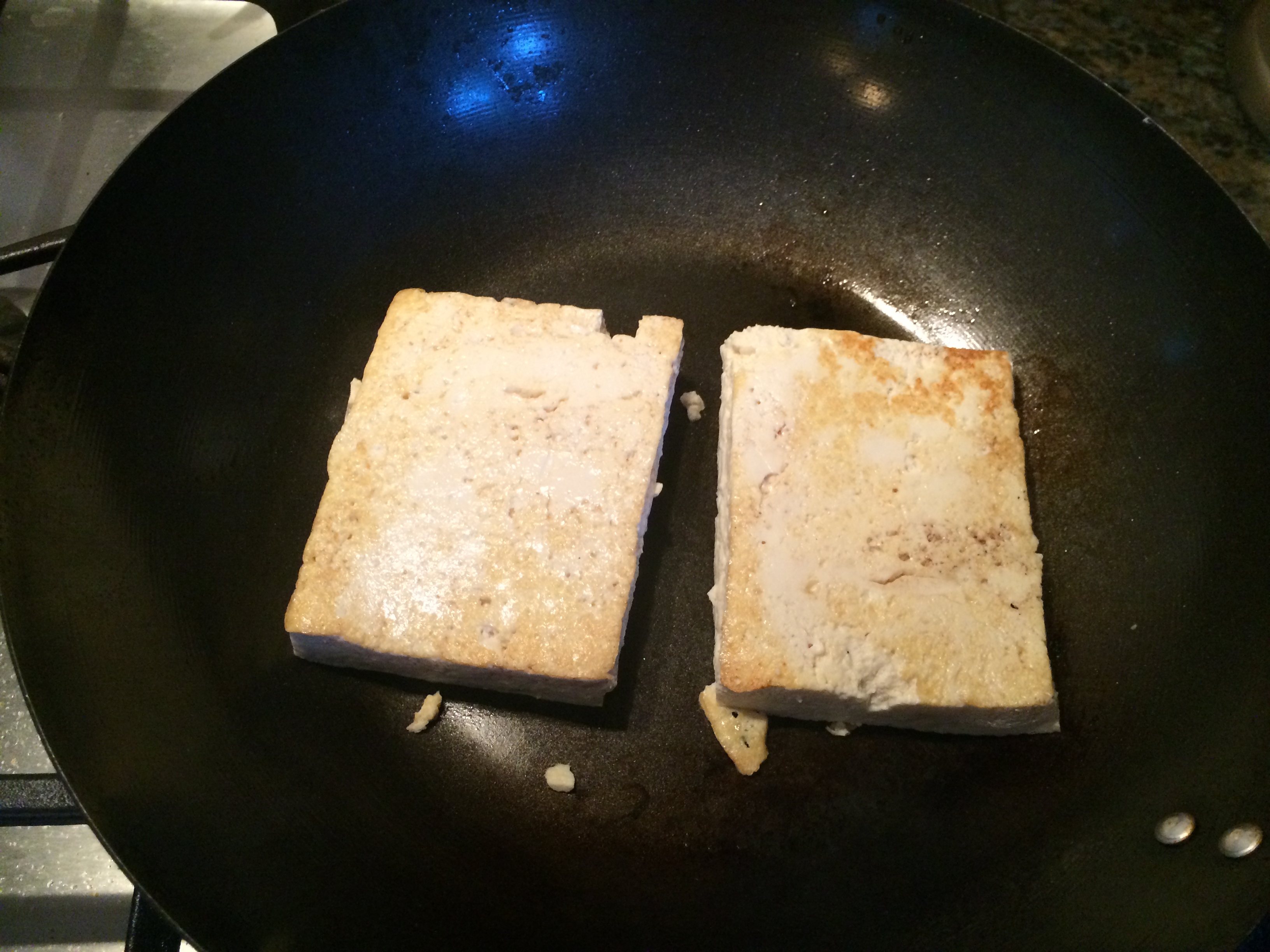 Then, place your two piece of tofu in the pan to brown: