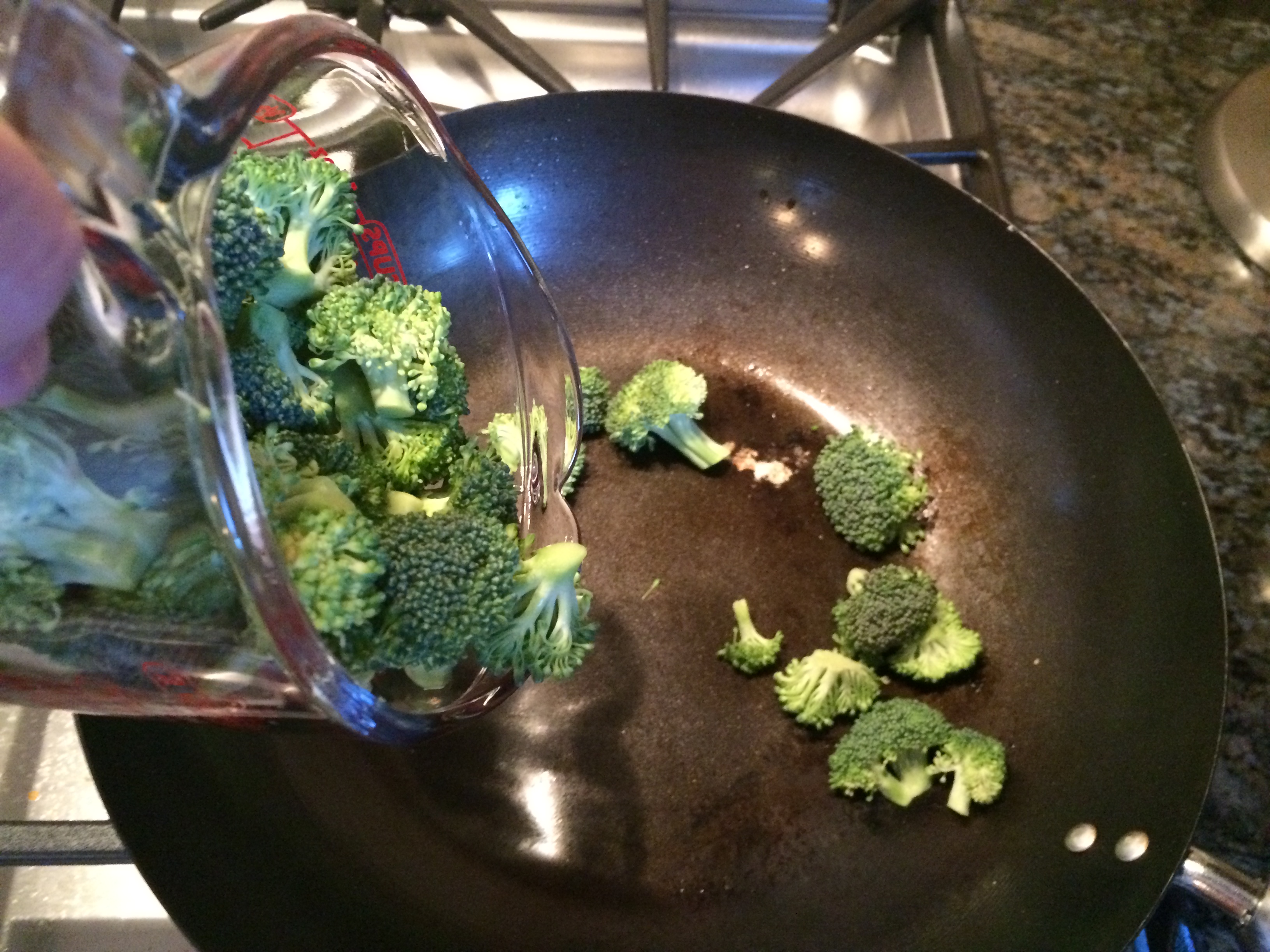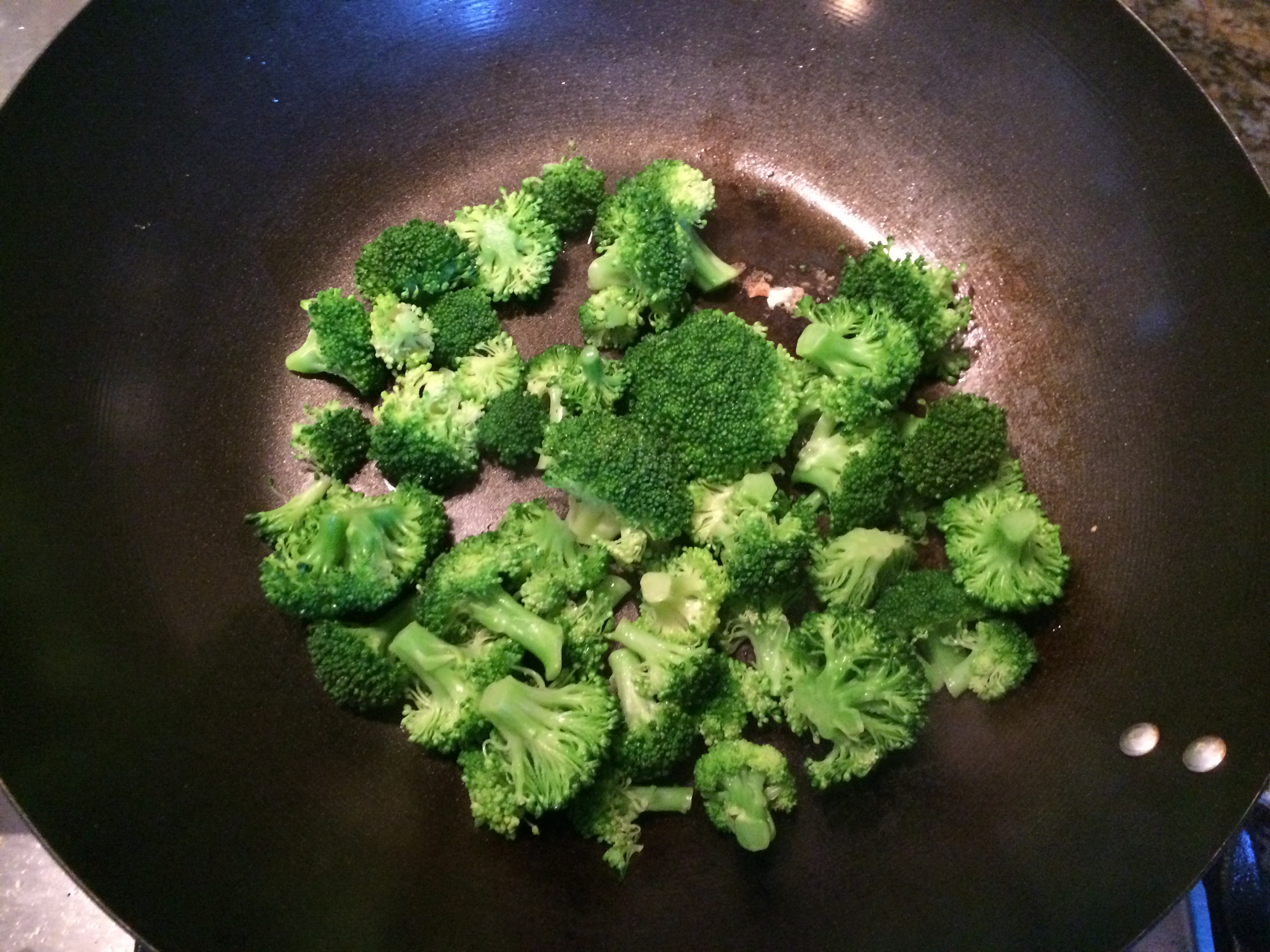If you’re a multi-tasker, you can do this task while the tofu is cooking. You can either steam your broccoli in the wok, in a steamer, in the microwave, or in another pan. Whatever is convenient for you. I steam the broccoli by placing it in the wok, adding 1/8 cup of water, turning the stove to medium, covering, and cooking for 2 minutes. This cooks the broccoli just enough so that it’s edible. I like to think of it as “parboiling” the broccoli in preparation for the stir fry.