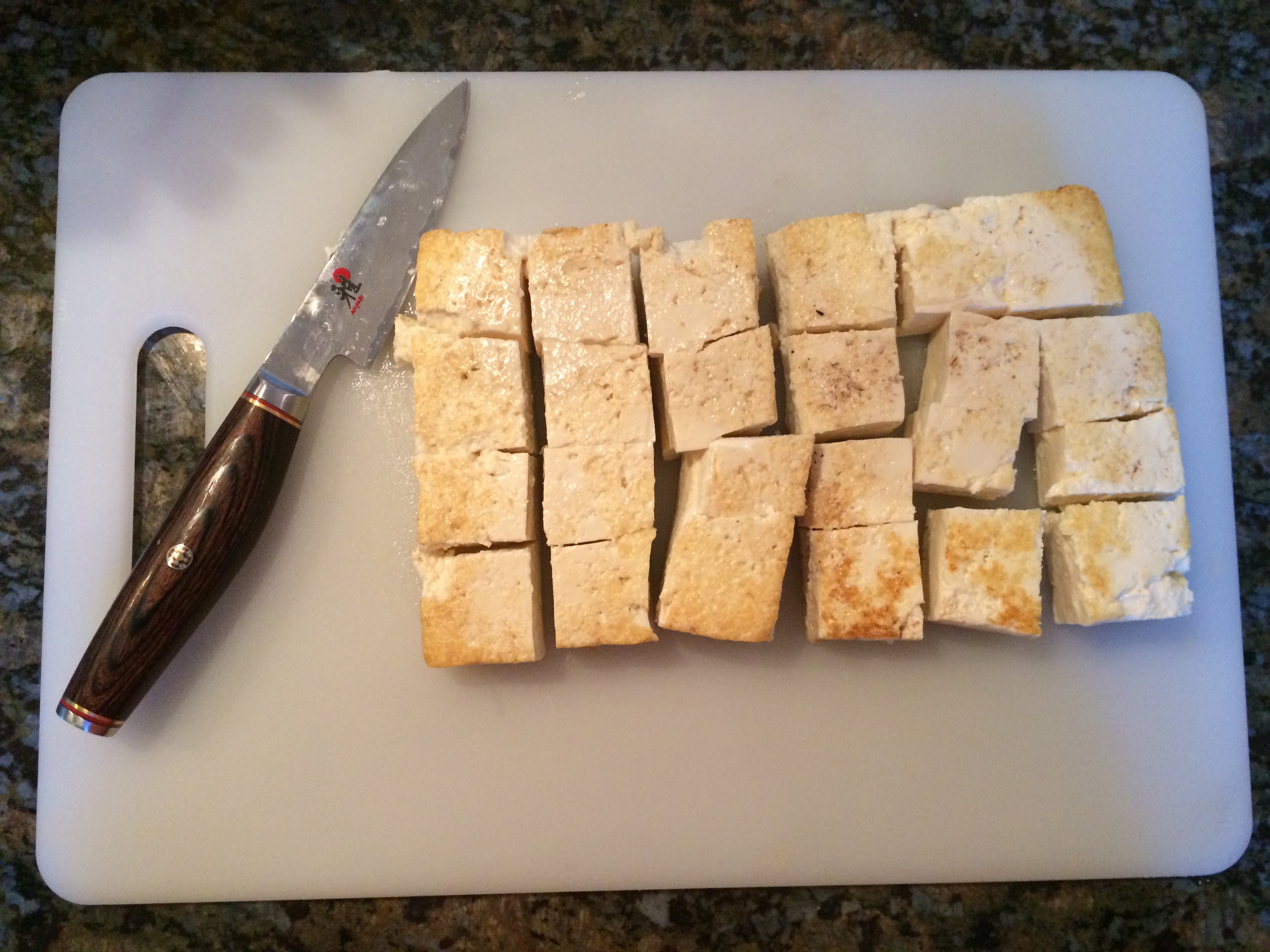 While the pan is heating, quickly cut the tofu into bite sized cubes: