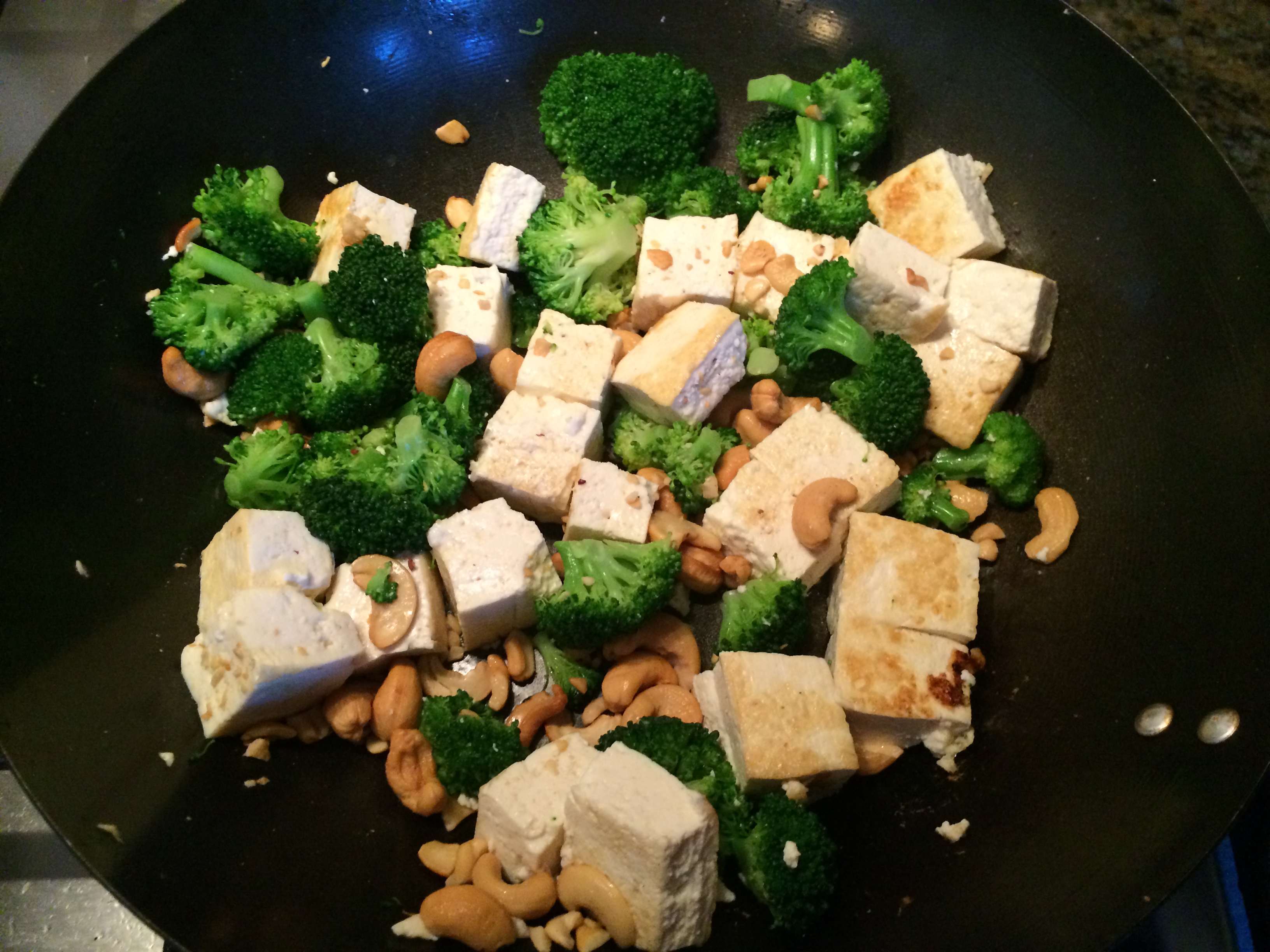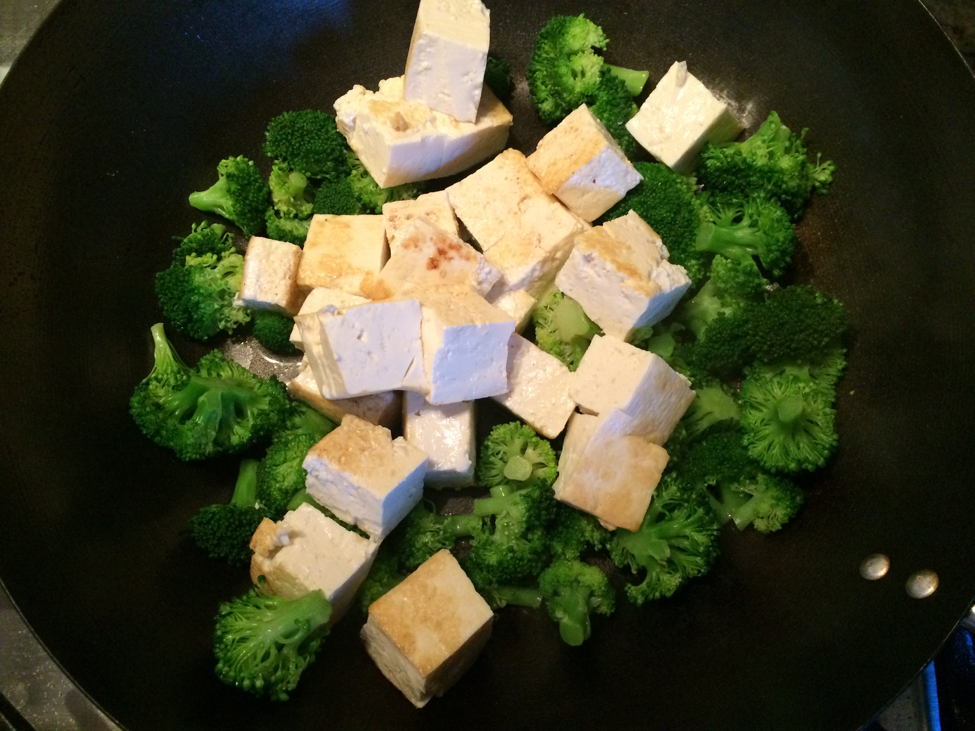 Turn the heat on the stove back up to “high”, and add the tofu to the broccoli