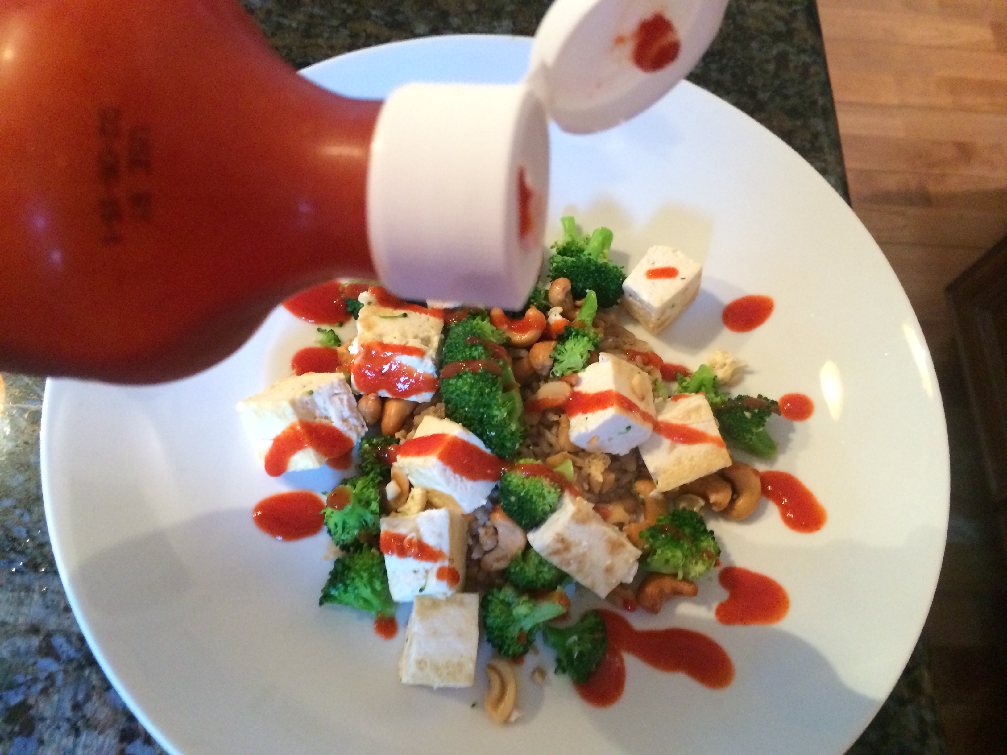 Using a wooden or silicon spatula, stir fry the ingredients for two minutes. This means, move the food around and don’t let it burn! After two minutes, transfer to plates with rice or greens on them, and top with Sriracha sauce.