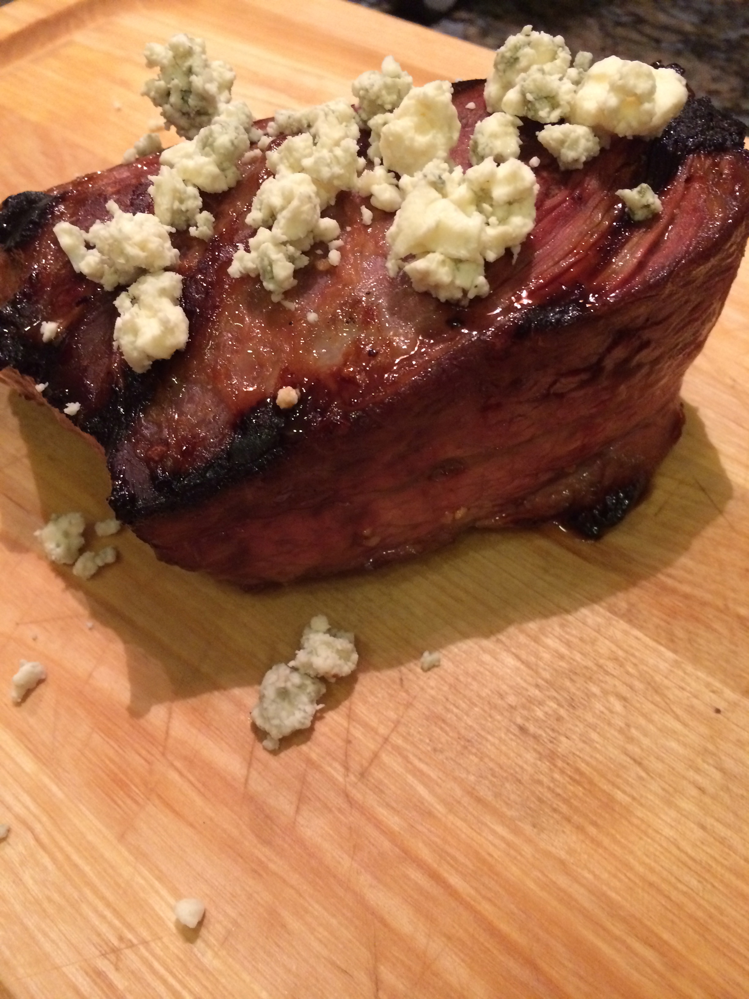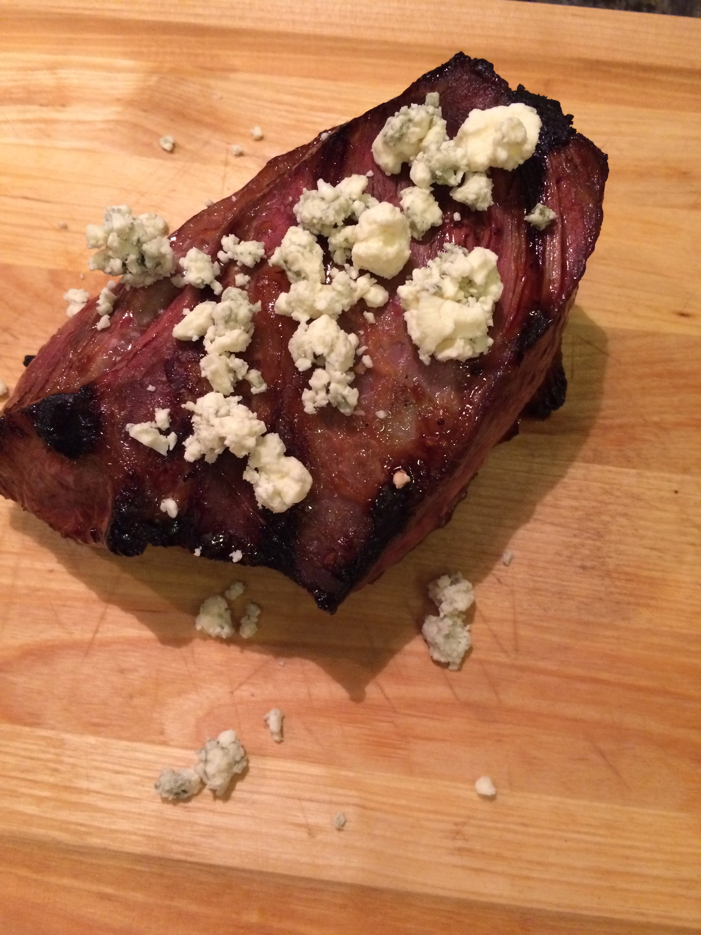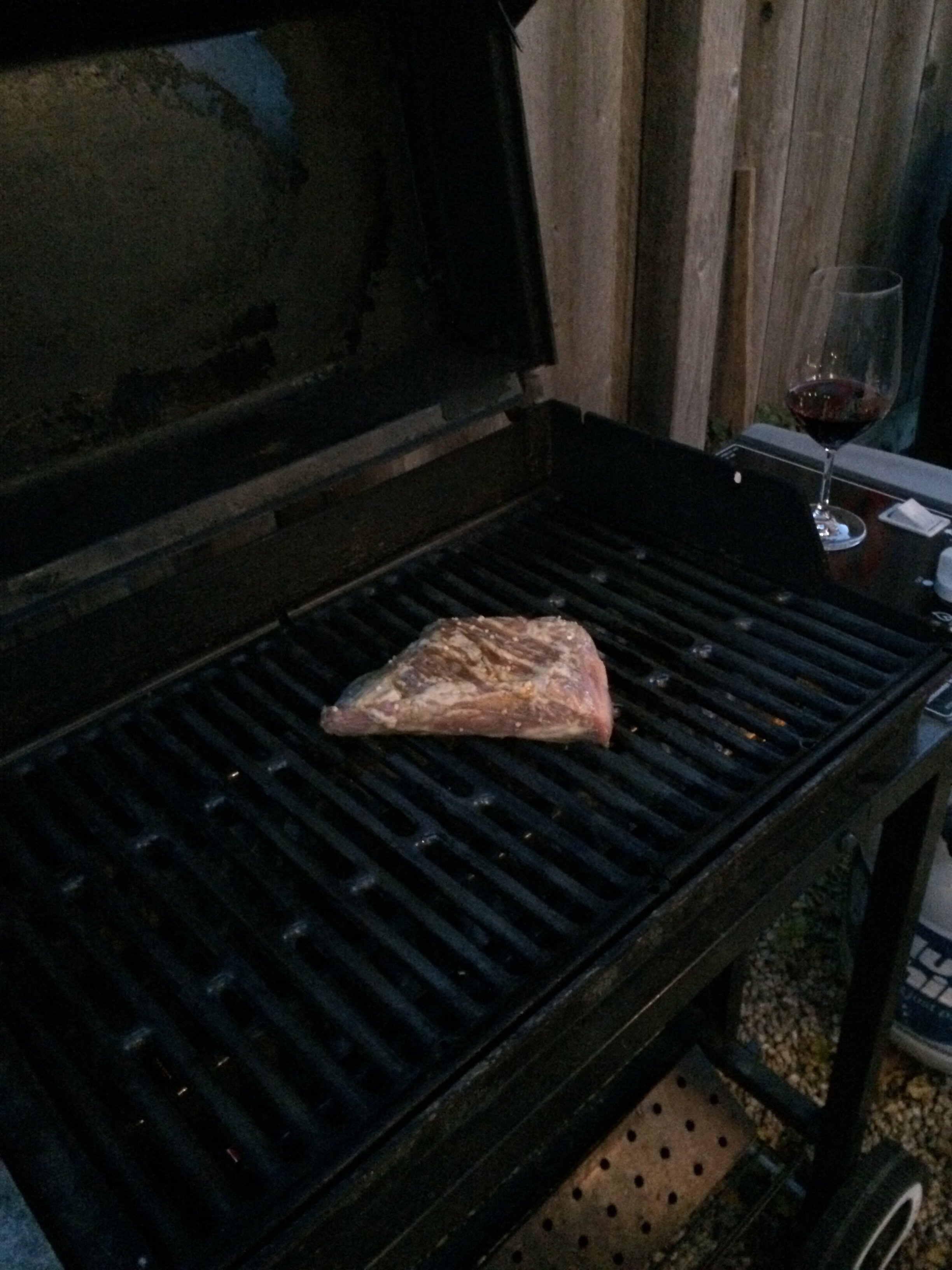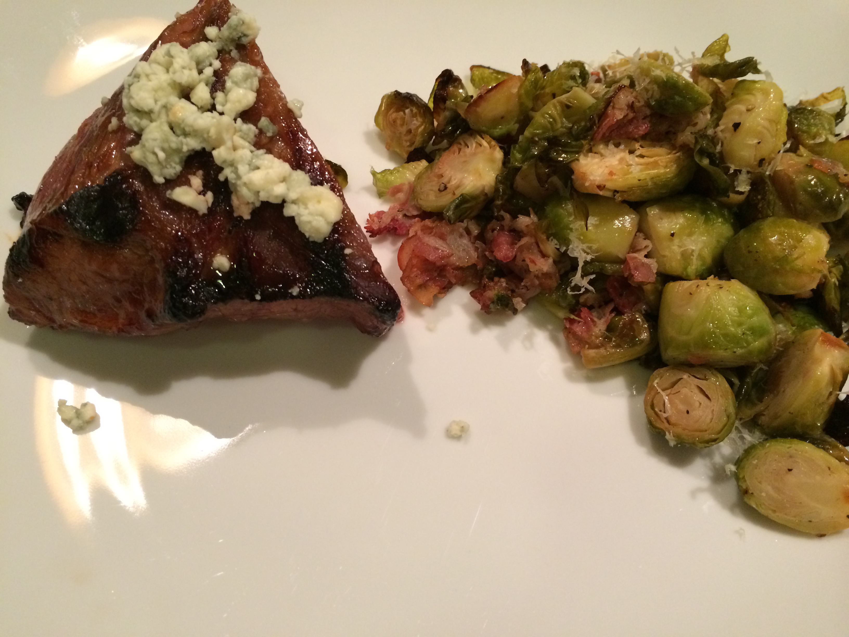 On the morning (or a few hours) before you make your steak, you’ll want to marinate the steak. The longer you marinate it (within reason), the juicier the steak will be. However, if you really want to make this, and only have a few hours, don’t freak out. A few hours of marinating is enough to ensure a delicious meal, especially if you’re working with a nice piece of steak. Start by taking out your tri tip, putting it in a small, shallow dish, and covering it with the garlic and the orange juice concentrate.  (You can also use a large, resealable bag that everyone calls by its brand name, but I am trying not to) The orange juice concentrate really tenderizes the meat and leaves it with a slight citrus flavor, which is absolutely delightful.  It also makes the steak a little more forgiving for any grilling errors, whether they be owing to forgetfulness, being new to grilling, or (as most grilling errors are) beverage enhancements.IMG_3734 IMG_3736 IMG_3739 IMG_3741 After your steak is cloaked in garlic and frozen orange juice concentrate, cover with plastic-wrap and put in the fridge.  Marinate between 4-12 hours. If you have the time, flip the meat halfway through the marinade to make sure both side of the steak are tenderized. When you’re ready to cook the steak, the first thing you’ll do is make sure your grill is ready. We use a gas grill, so it’s essential that we have adequate amounts of propane (not that we’ve ever made that mistake… multiple times… )  Make sure your grill is clean and hot. Start by turning your grill on, and heating it on high with the lid closed. IMG_3855 We use a small gas grill, and it gets very hot very quickly. Heat the grill for 5-10 minutes. Open the grill, and using a heavy wire brush cleaner, brush the grates and remove any remnants of former meals and grease. After the grill is clean, heat it to 400 degrees and give it a couple minutes to stabilize at that temperature. IMG_3858 While the grill is heating, start preparing the brussels sprouts. First, heat the oven to 450 degrees. Then, wash the sprouts: IMG_3744 After you wash the sprouts, lay them on a paper towel to dry. Cover them with another paper towel and get the sprouts as dry as possible. IMG_3745 Move the brussels sprouts to a cutting board, and cut them up. First, start by cutting off the inedible bottom parts. If the sprouts are small, just cut the remainder of each in half. If the sprouts are big, cut them in four pieces. IMG_3747 Throw the sprouts in a big, oven safe dish that is large enough to accommodate all the sprouts in one layer (or they will never cook).IMG_3749 Cut up the pancetta. Pancetta is italian bacon and it is so good. IMG_3750 Toss the pancetta with the brussels sprouts IMG_3752 Cover the sprouts with 1 Tb. of olive oil, 1 tsp. of kosher salt, and 1/2 tsp. of freshly ground black pepper. IMG_3753 IMG_3754 IMG_3756Toss the brussels to ensure that they’re all covered with the olive oil, seasoning and pancetta, and put in the 450 degree oven. Set a timer for 35 minutes. Stir every 10 minutes to make sure the brussels sprouts get crisp but don’t burn. Make sure that you take your steak out of the refrigerator and shake off the excess marinate at least a half hour before you grill it. You want the steak to come close to room temperature before you grill it. Before putting it on the grill, season the steak with the Worcestershire sauce, Tabasco, salt and pepperIMG_3758 When the grill is at 400 degrees, put the steak on the middle of the grates, between the front and back burners. The idea is the heat is a little less direct, and any fat that drips off won’t hit the flames underneath (and make them big flames ). IMG_3763 IMG_3781 Close the lid and grill for 12-16 minutes at 400 degrees, depending on the degree of pinkness you like in steak.  You will flip the steak the scientifically-proven optimum number of times to flip steak: ONCE.  In the interim, you should touch it the equally scientifically-proven optimum number of times to poke, prod, jiggle, or even stare at your steak with an overly judgmental glare: no times.   If you are the impatient type, grab a glass of wine and enjoy a beautiful evening.   If your father-in-law is the impatient type, and has to be chased away from the grill, grab a bottle of wine and walk about pointing at things in the backyard that you will improve “someday.”  But don’t ever give up the pink flamingos.IMG_3785   This thing can stay too.IMG_3767 While the steak is cooking, give the brussels a stir. IMG_3759 After 12 minutes on the grill, flip your steak. When you flip your steak it will look something like this: IMG_3789 After you flip the steak, close the lid and grill at 400 degrees for 10-14 more minutes. While the steak is cooking, move back to the kitchen and check on the brussels. They should be done after cooking for about 35 minutes. At that time, pull the brussels out of the oven using oven mits, and if you would like a little more decadence, using a microplane grater, grate some Parmigiano-Reggiano or Peccorino cheese over the brussels sprouts. IMG_3761 IMG_3762 Right about when you pull your brussels out of the oven, your steak will be ready. Turn off the oven, and put the brussels back in to keep them warm. Go to your grill and place your steak on a cutting board. IMG_3793 After the ten minutes, the steak will be medium rare. Let the steak rest for 10 minutes before cutting it. While it’s resting, top with the 1/4 cup of blue cheese. IMG_3794 After letting the steak sit for ten minutes, cut it into serving sizes. This feeds two very hungry people, or four moderately hungry people. You can also use a bigger piece of meat with essentially no other changes to the recipe. After the steak’s rested, plate your steak.IMG_3799   Take the brusells out of the oven and spoon them onto plates. Enjoy!  Beverage enhancements optional. IMG_3802