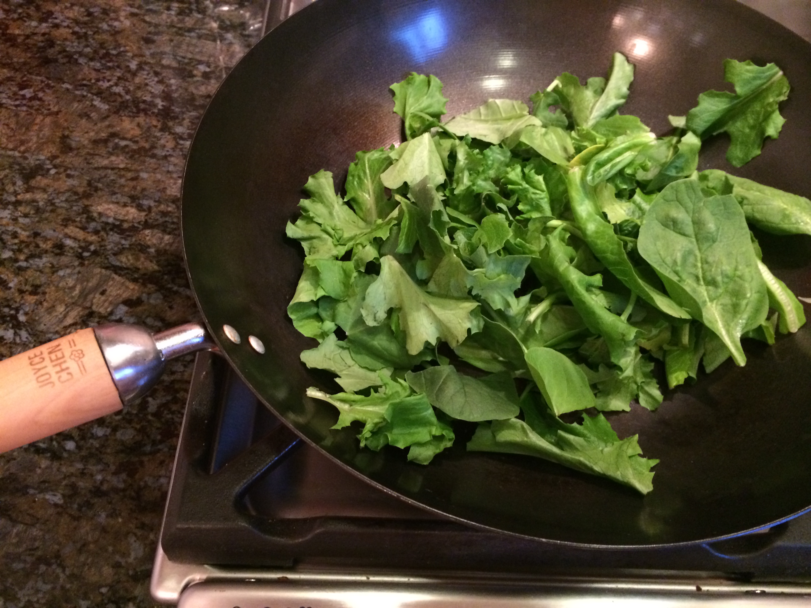Five minutes before the salmon is done, place your baby kale in a large pan on the stove top. Turn the stove up to “high”, throw in 2 Tb. of water, and quickly stir. The kale will almost immediately begin to wilt. The kale should be completely sautéed within 1-2 minutes.