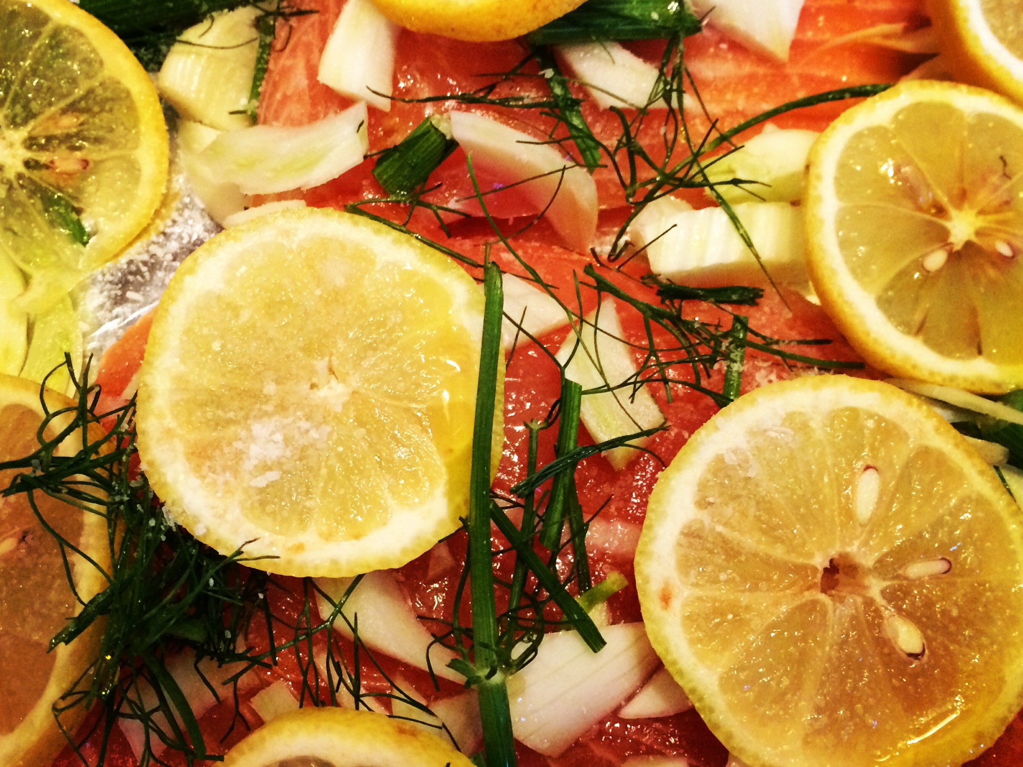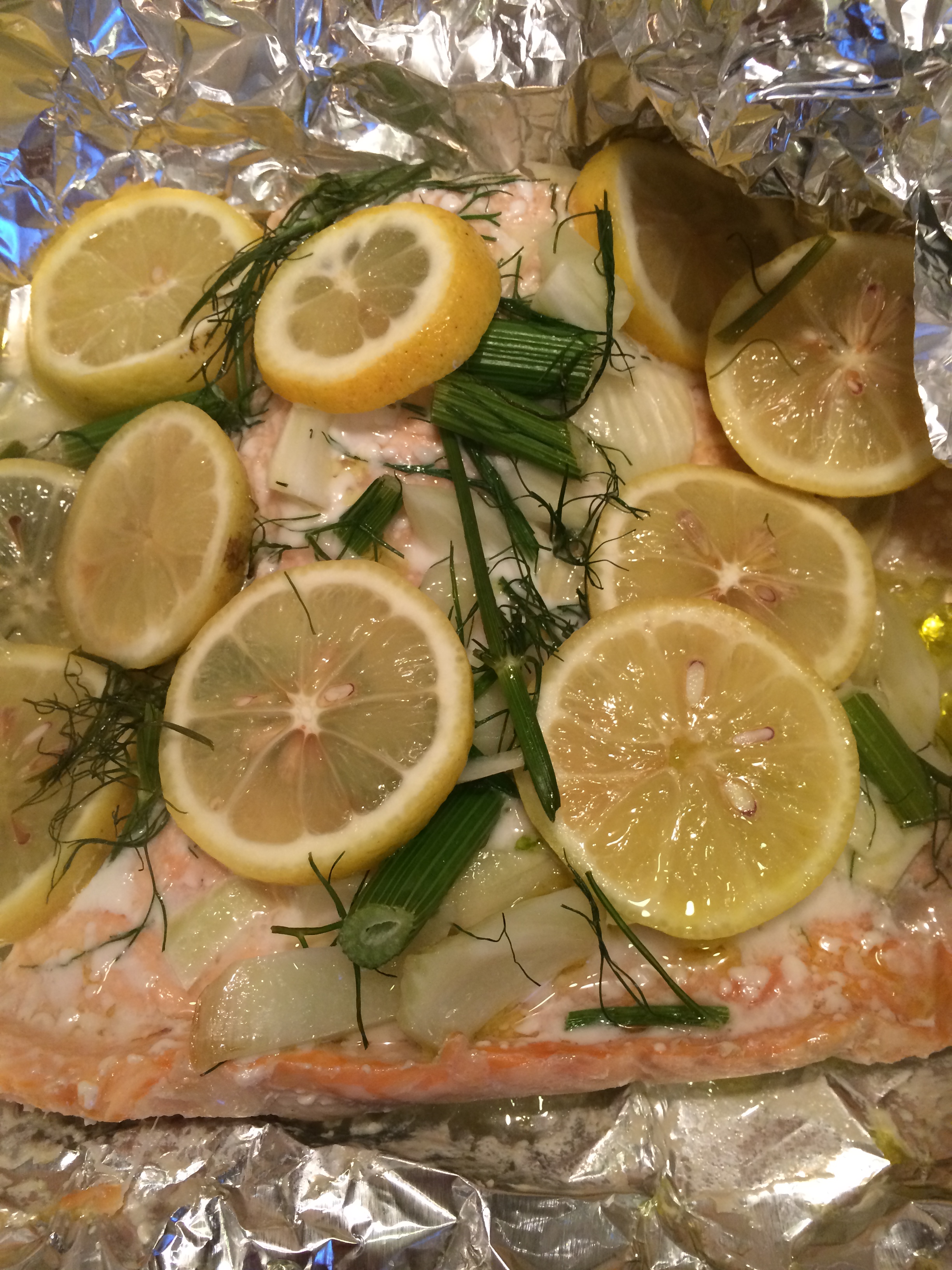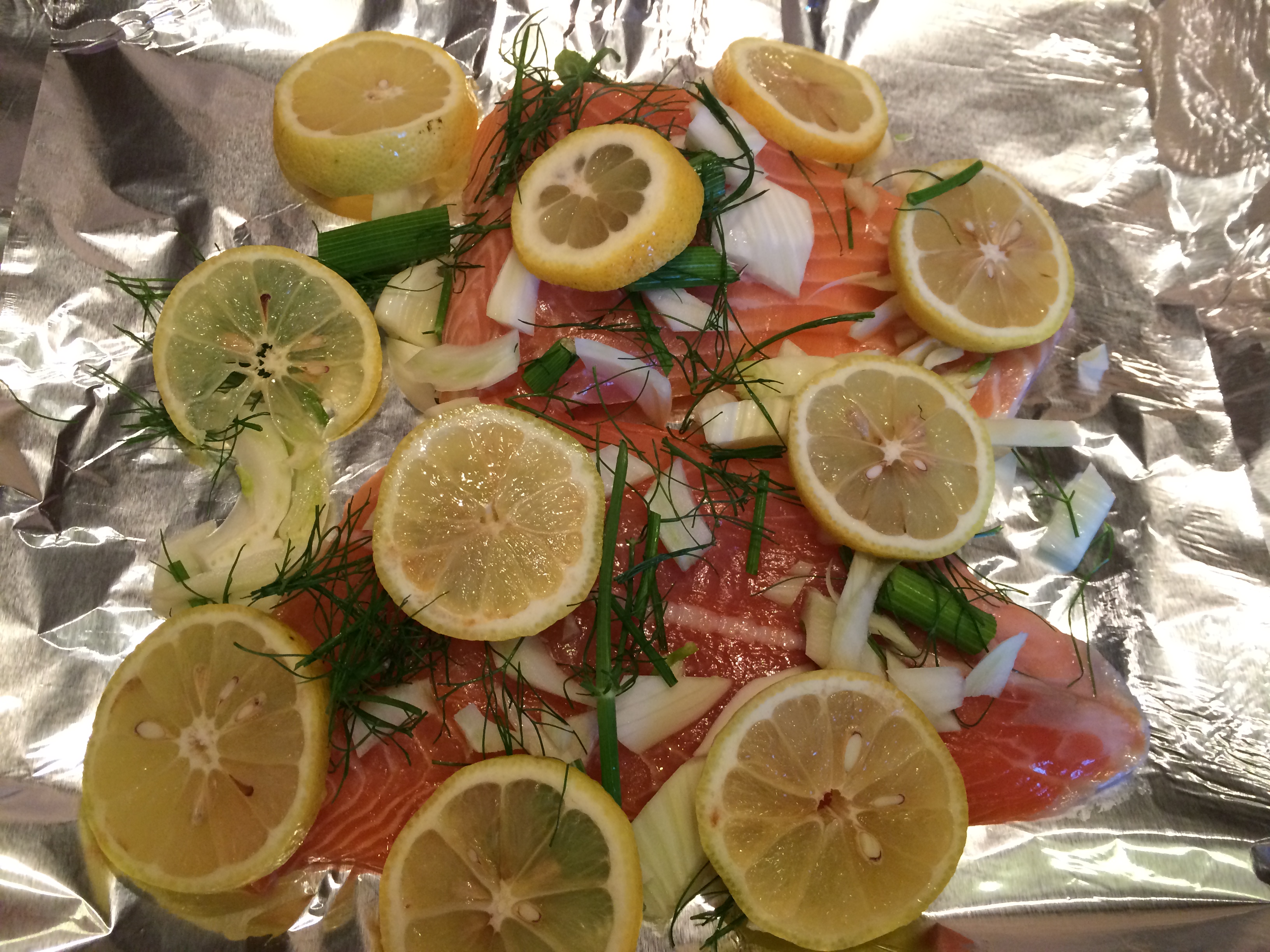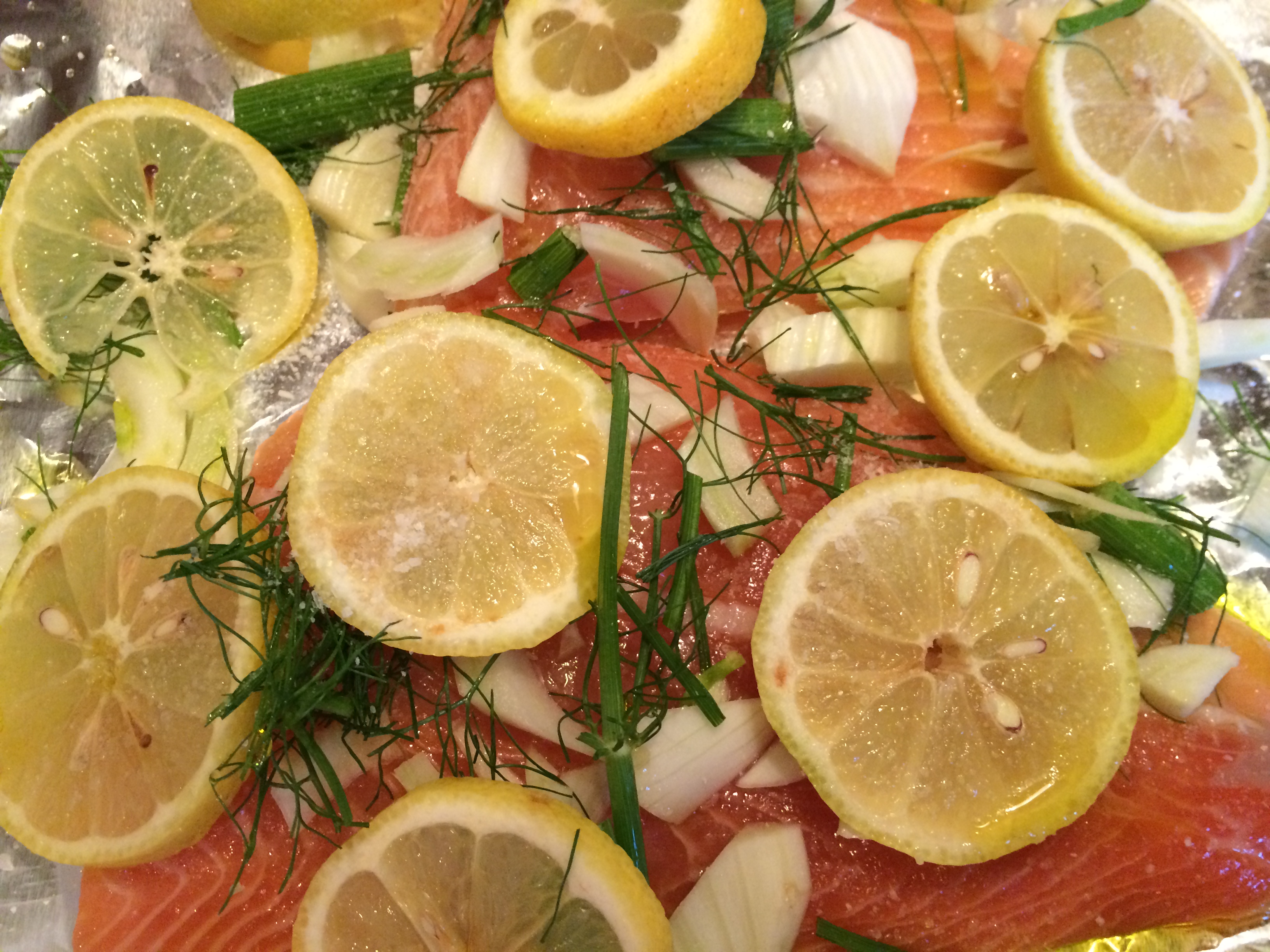 Take your chopped fennel, and your lemon, and layer these on top of the seasoned salmon. The fennel bulb has a slight licorice aroma, that diminishes as it’s roasted. The fronds taste fresh, like herbs. And, lemons give the salmon a zing and a brightness that brings out the almost nutty flavors in the fish.