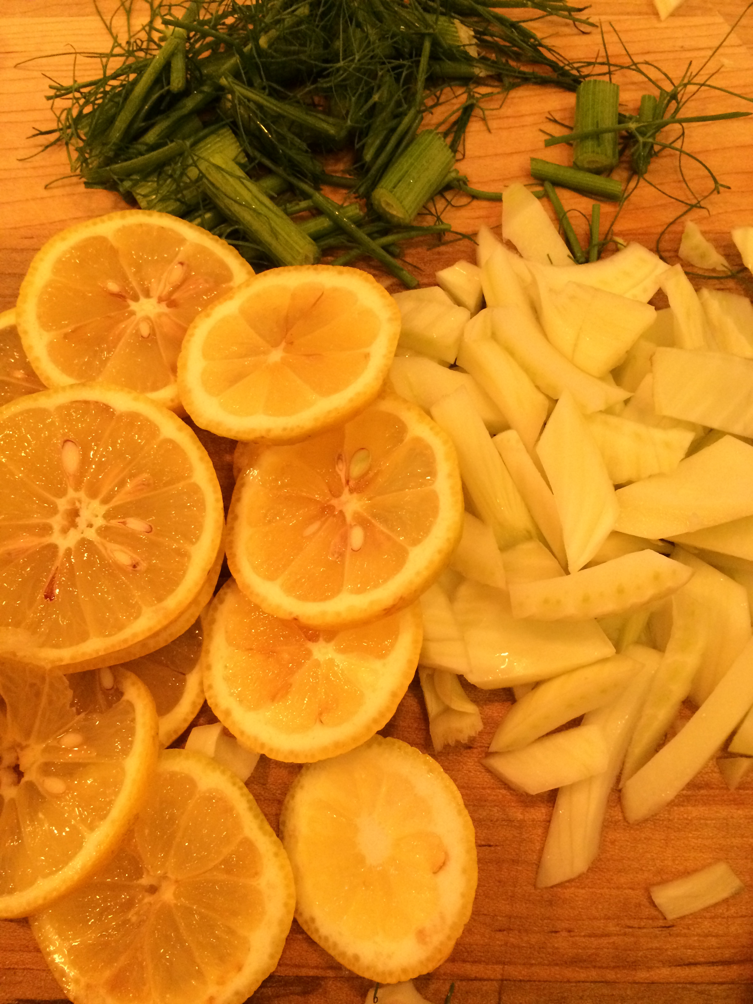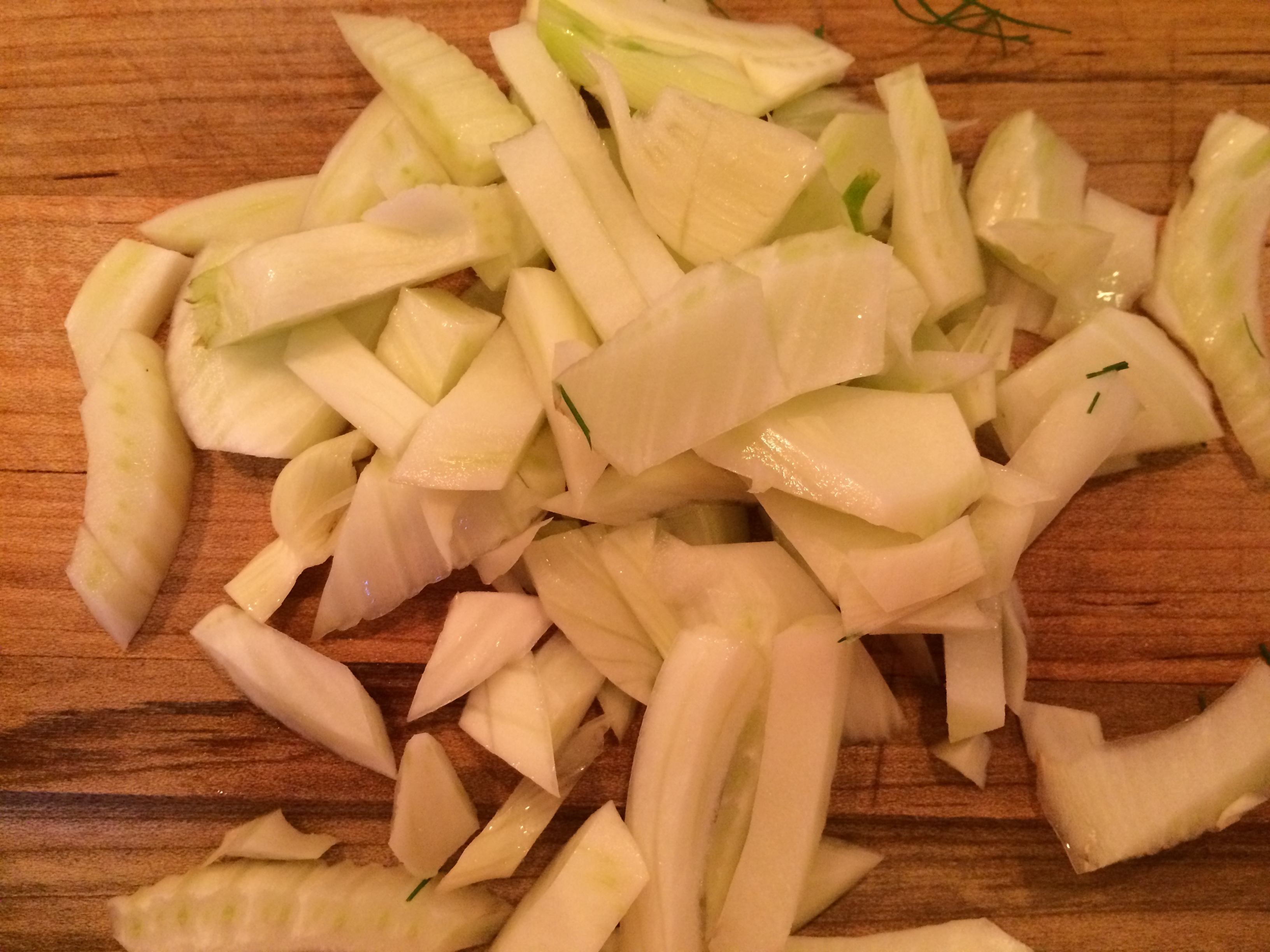 Coat the salmon with 1/2 Tb. olive oil and 1/2 tsp. kosher salt. Then, chop up your fennel bulb: