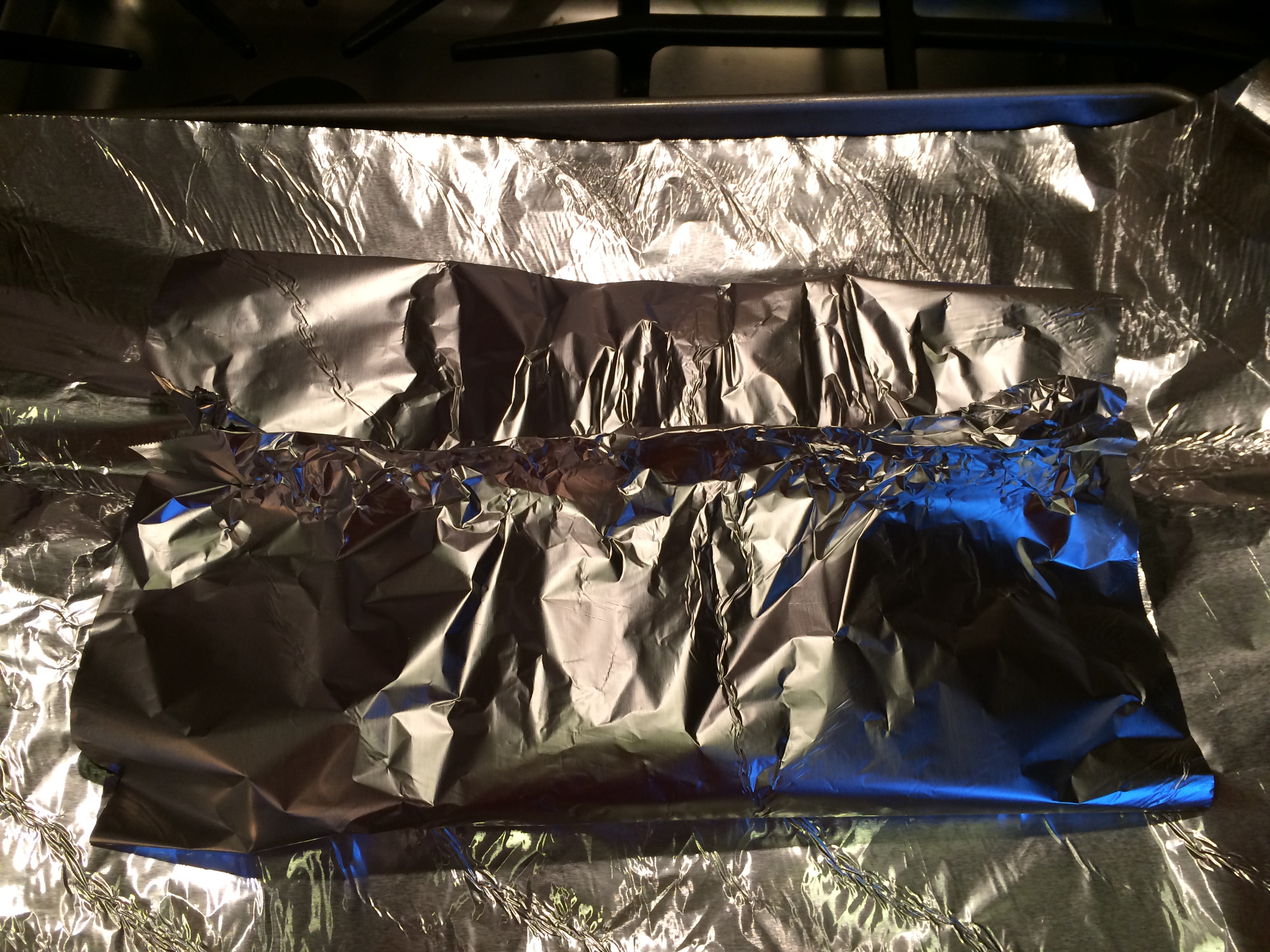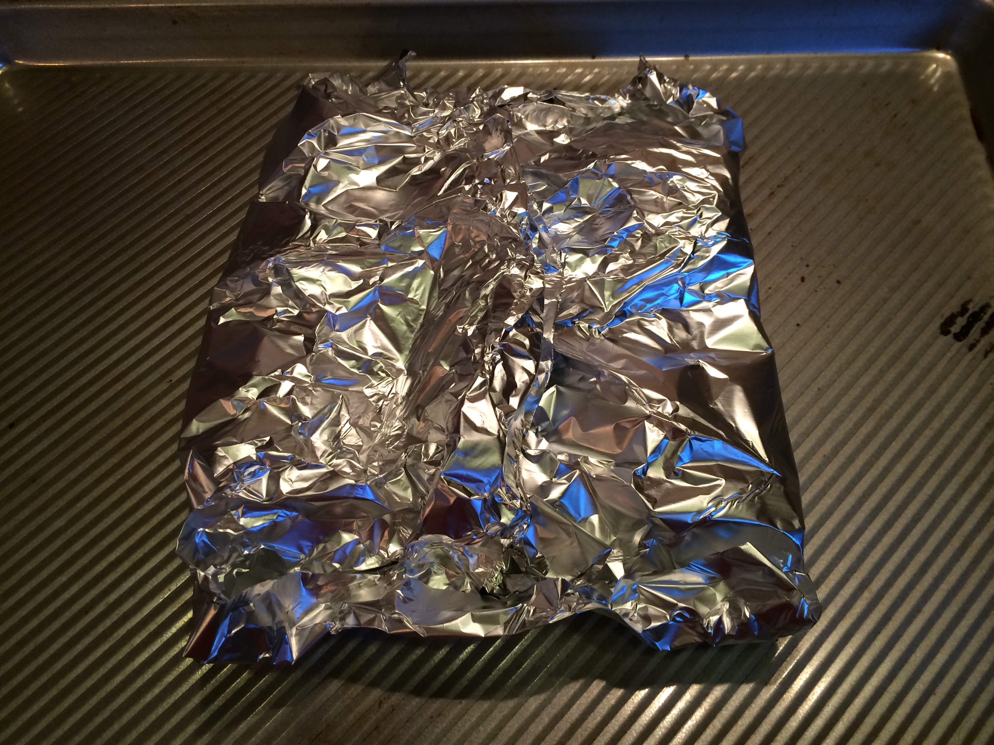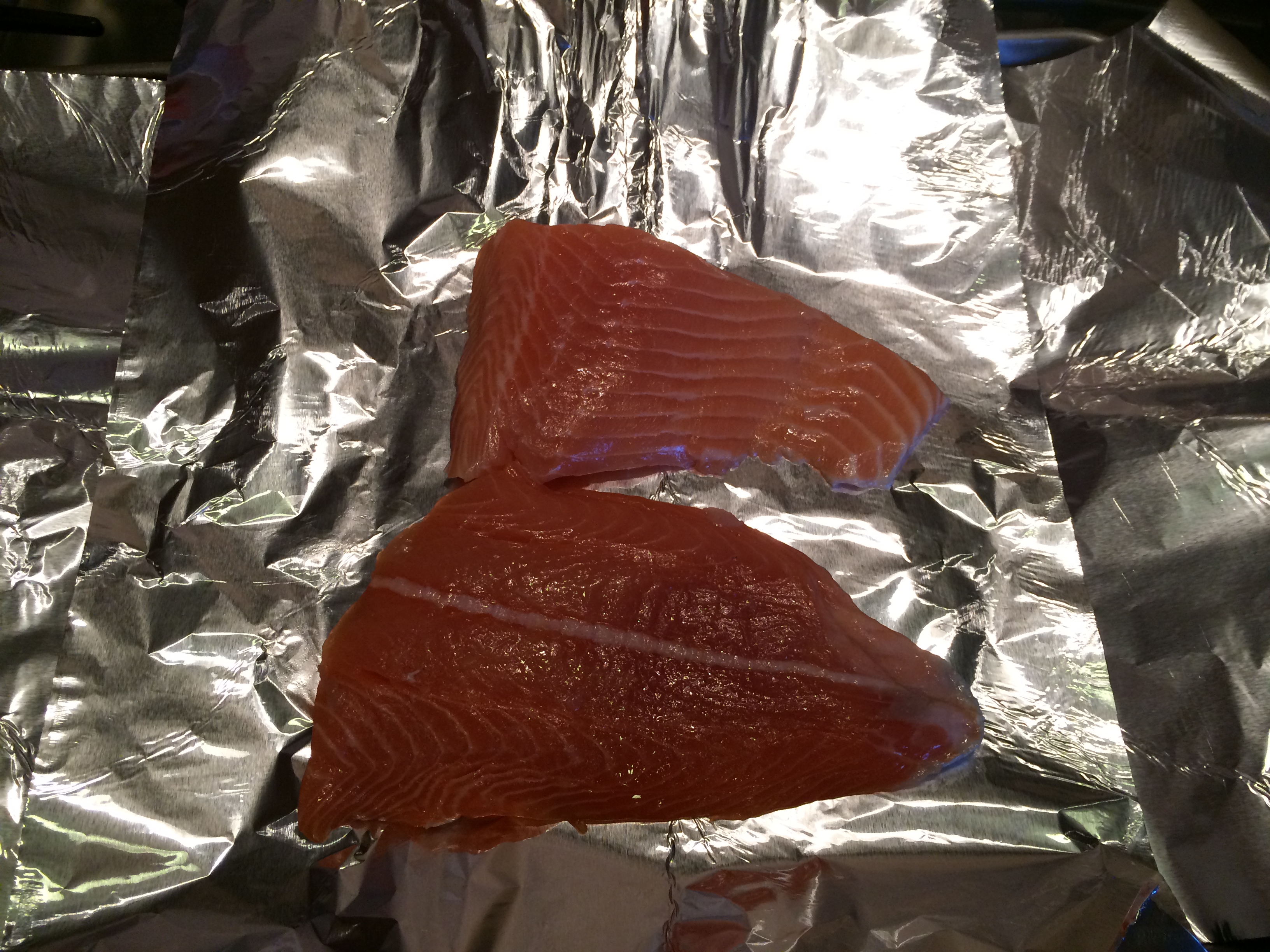 Heat the oven to 400 degrees F. On a baking sheet, put one large sheet of aluminum foil, and run another sheet on top of that, perpendicular to it, so it looks like an “X”. Place your salmon filets (skin side down if yours have skin) on the aluminum foil.