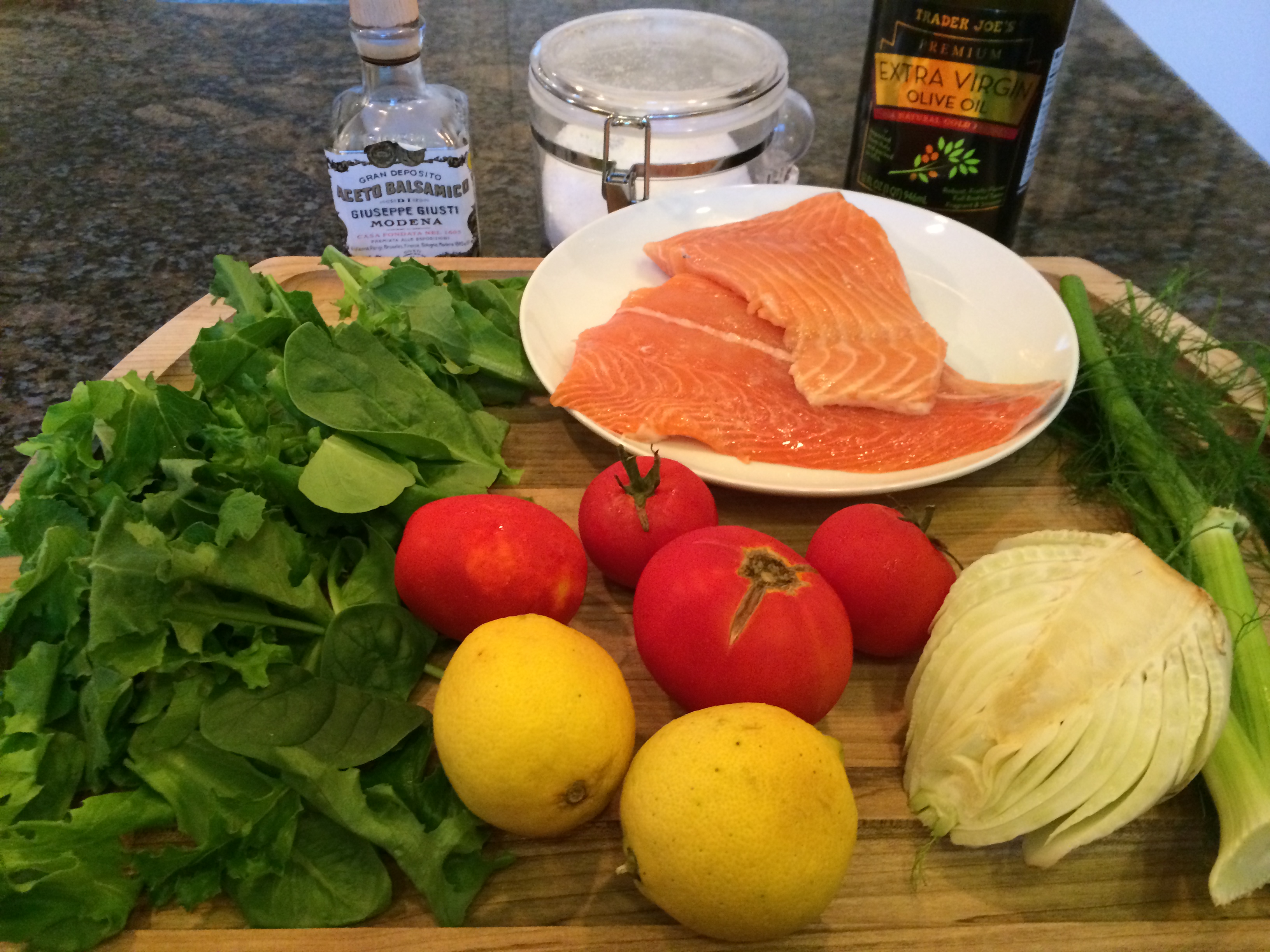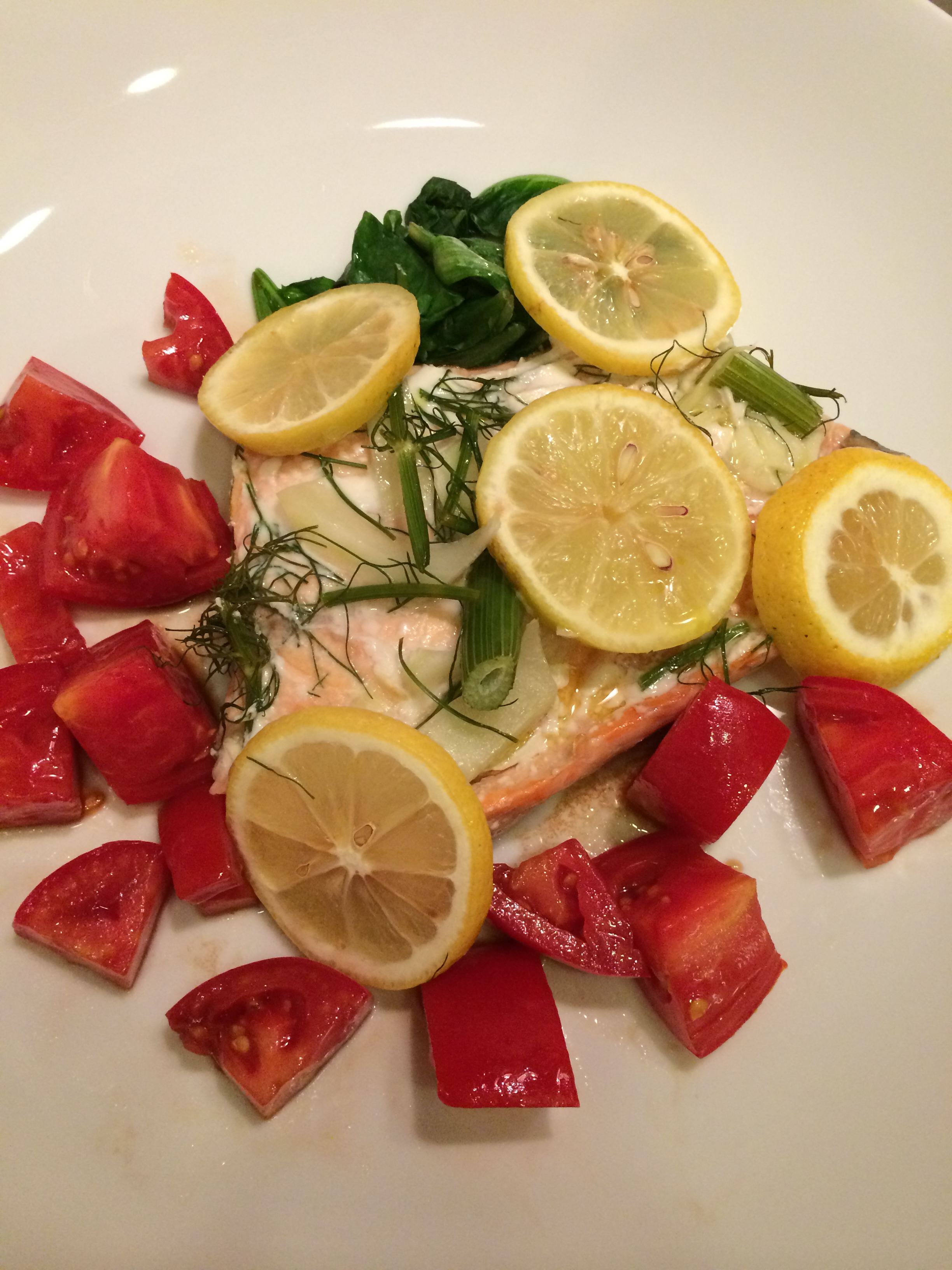 All that’s left is plating the salmon on top of the baby kale, and arranging the tomatoes around the plate. Dinner is served!