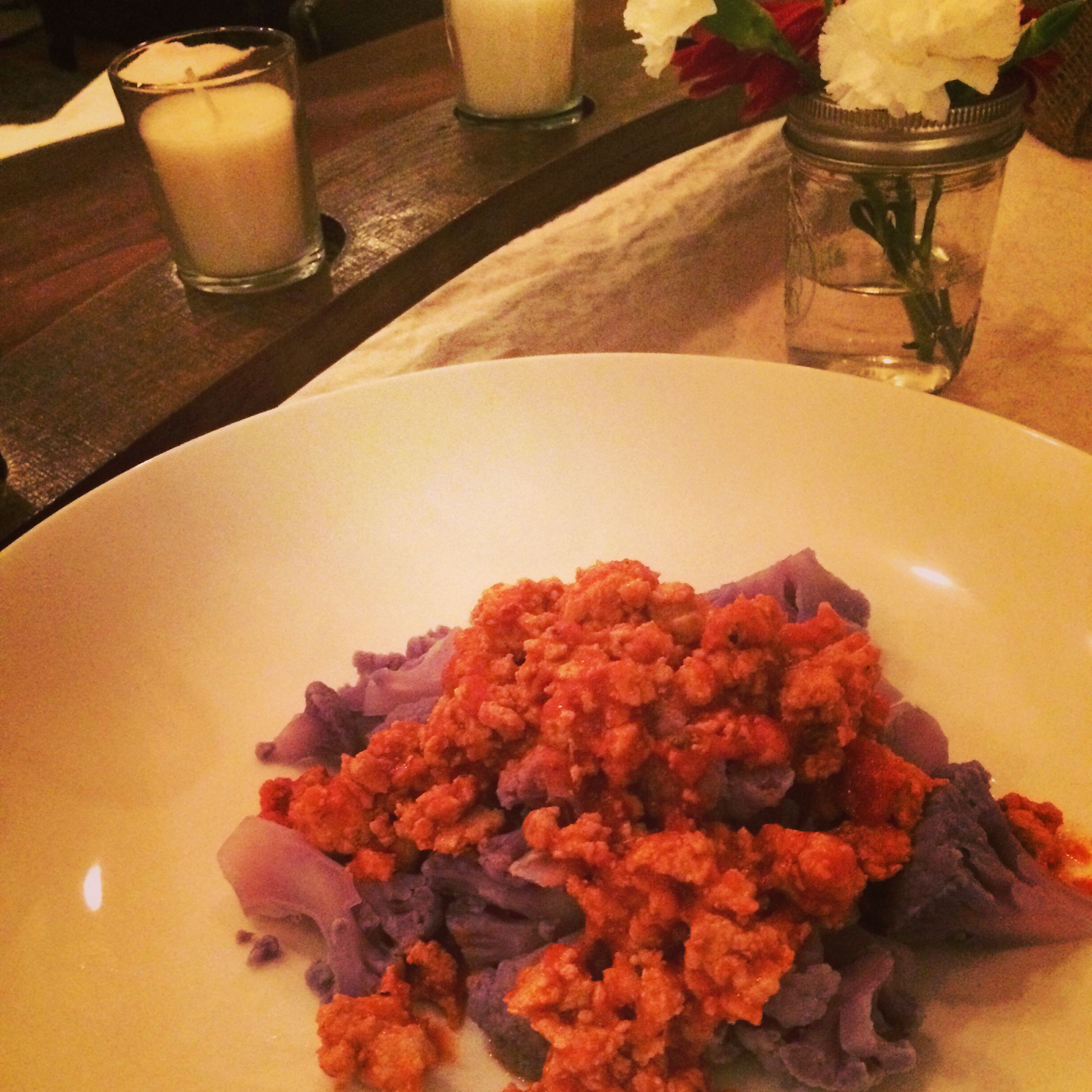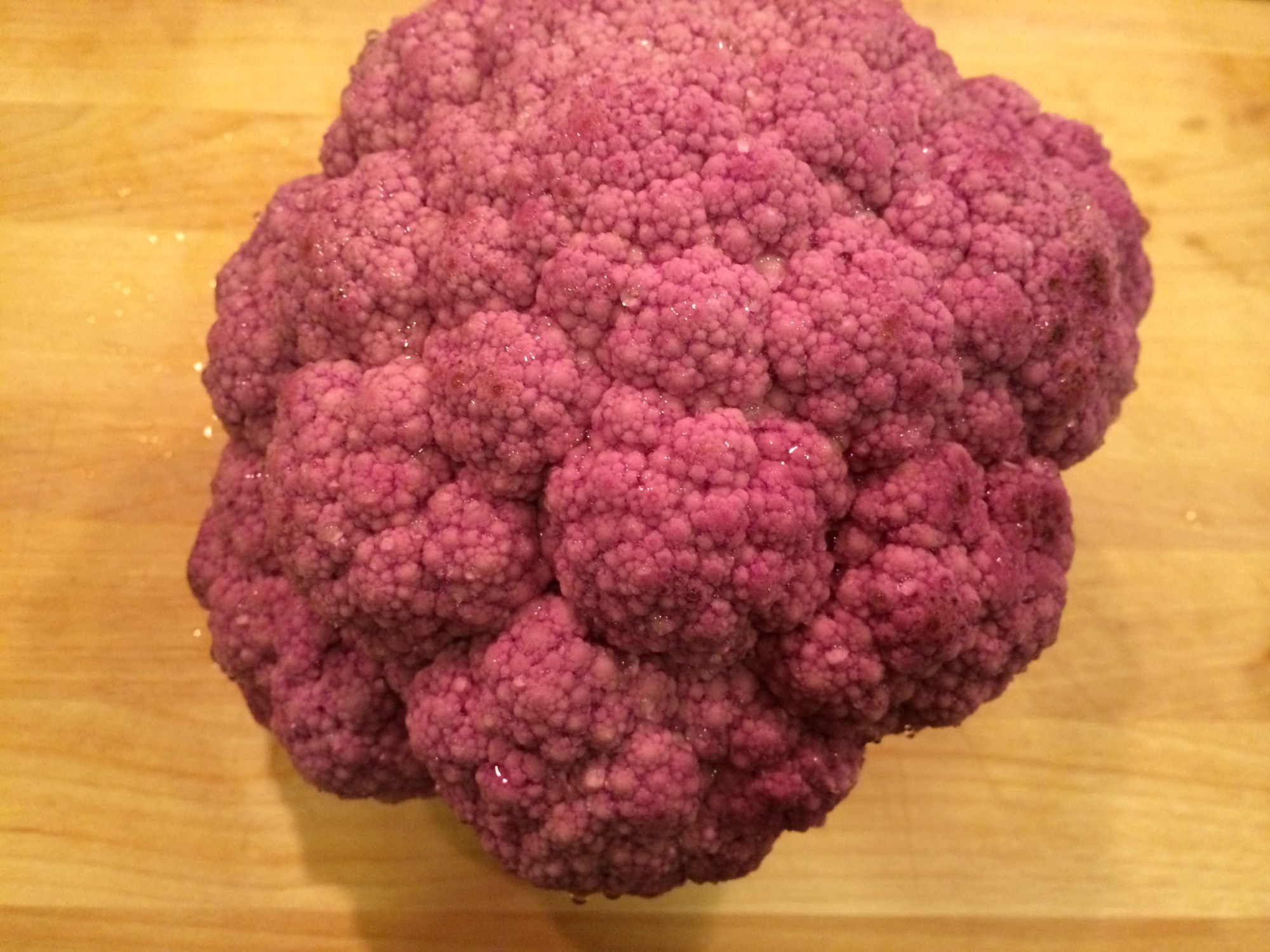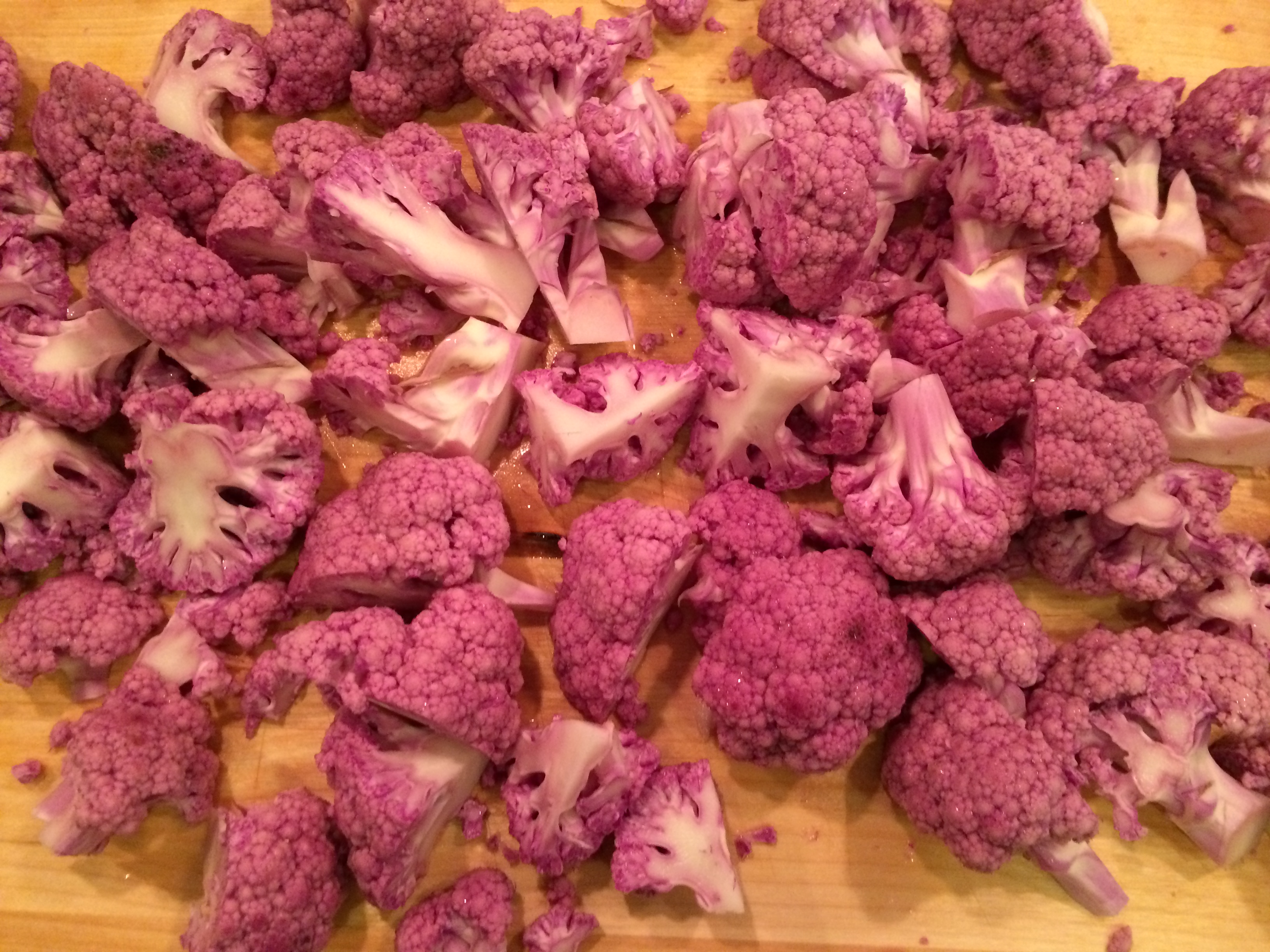 I love pasta. What I don’t love is that sluggish/fluffy/heavy feeling I get after I stuff my face with gallons of that gluttonous gluten. The answer: cauliflower. Thanks to the internet, I recently found an amazing recipe for a cauliflower based pizza crust (recipe coming soon), and I realized that I can use cauliflower as a substitute for many traditionally wheat-based dishes. This cauliflower “pasta” leaves you satisfied, without feeling overfed. It’s a great compromise for a meal when you want something hearty, but want to stay healthy. I bought purple cauliflower because I thought it was pretty — but any color will do!