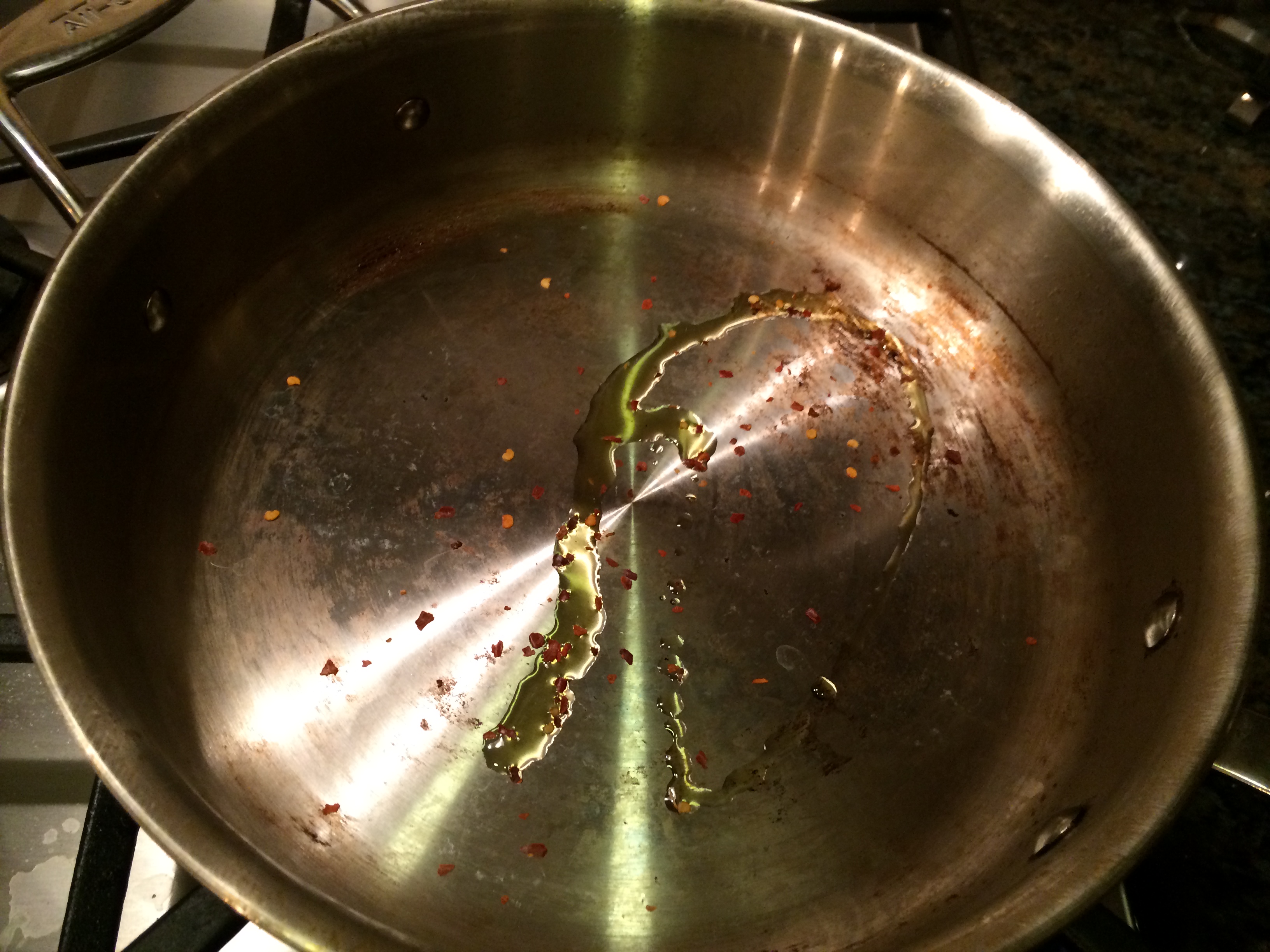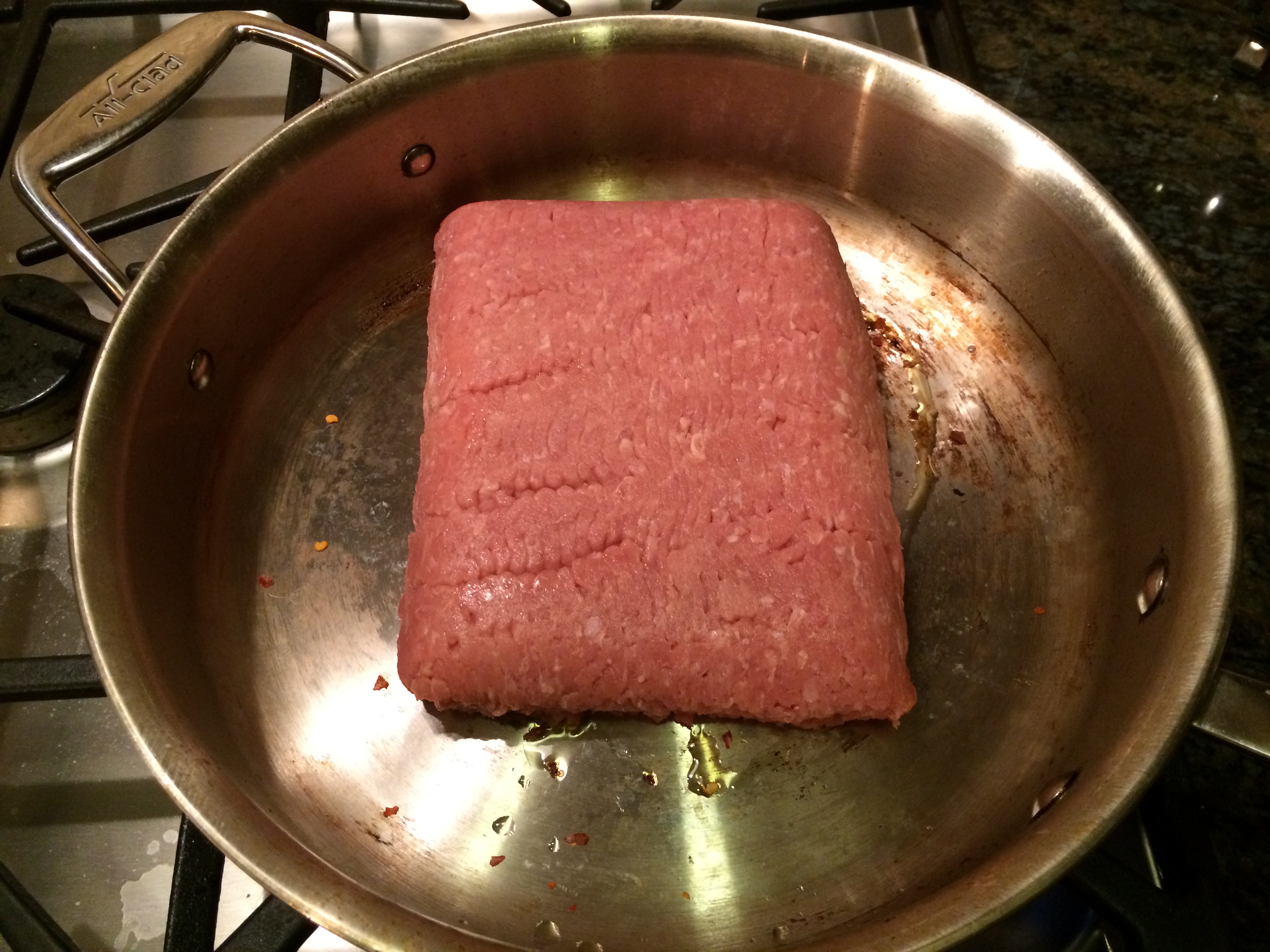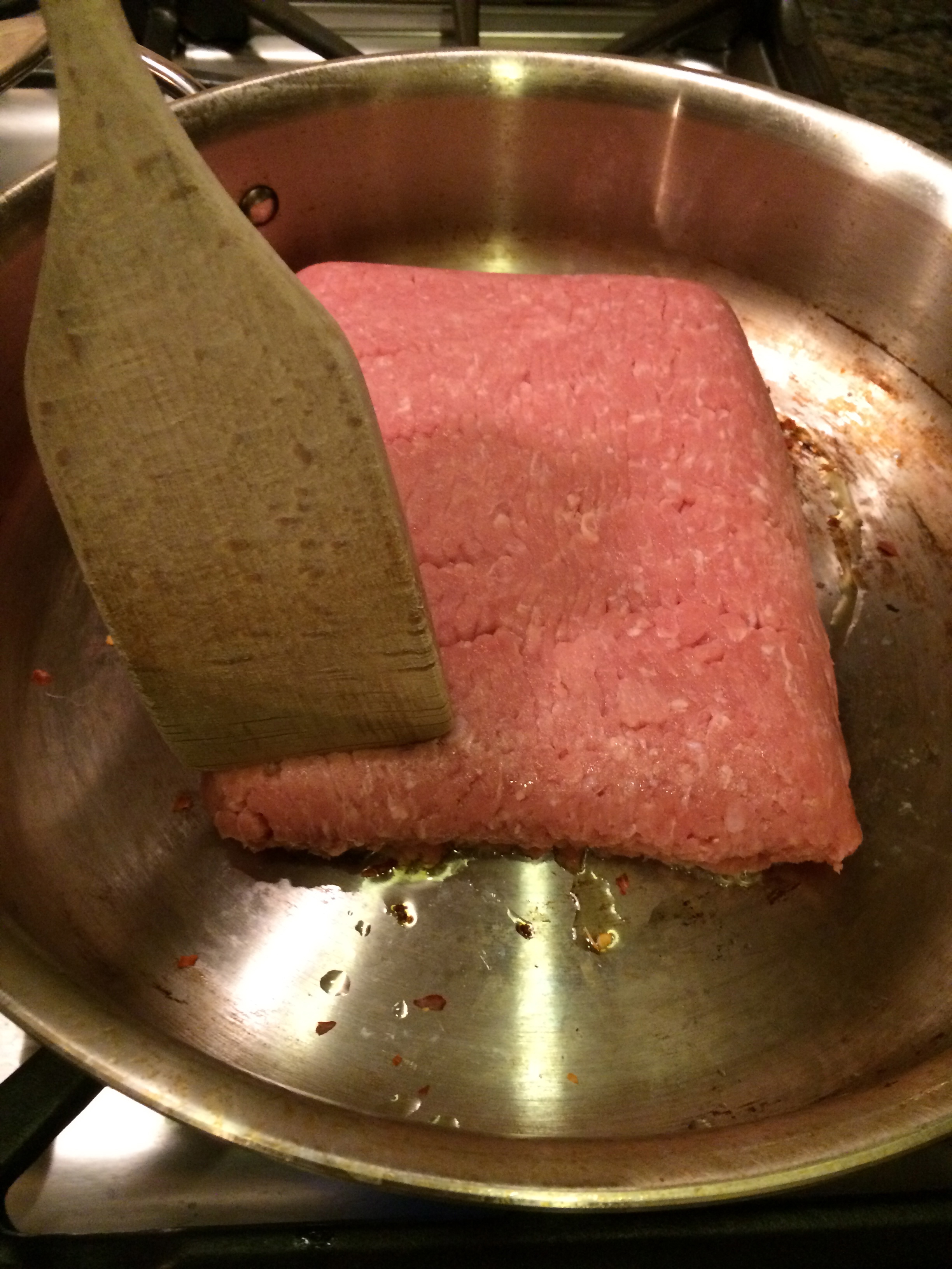 If the water has not quite boiled yet, start on your meat sauce. Put a big pan on the stove top, and add your olive oil. Shake a few sprinkles of the red pepper flakes in the pan. This will add some extra heat to your pasta sauce.