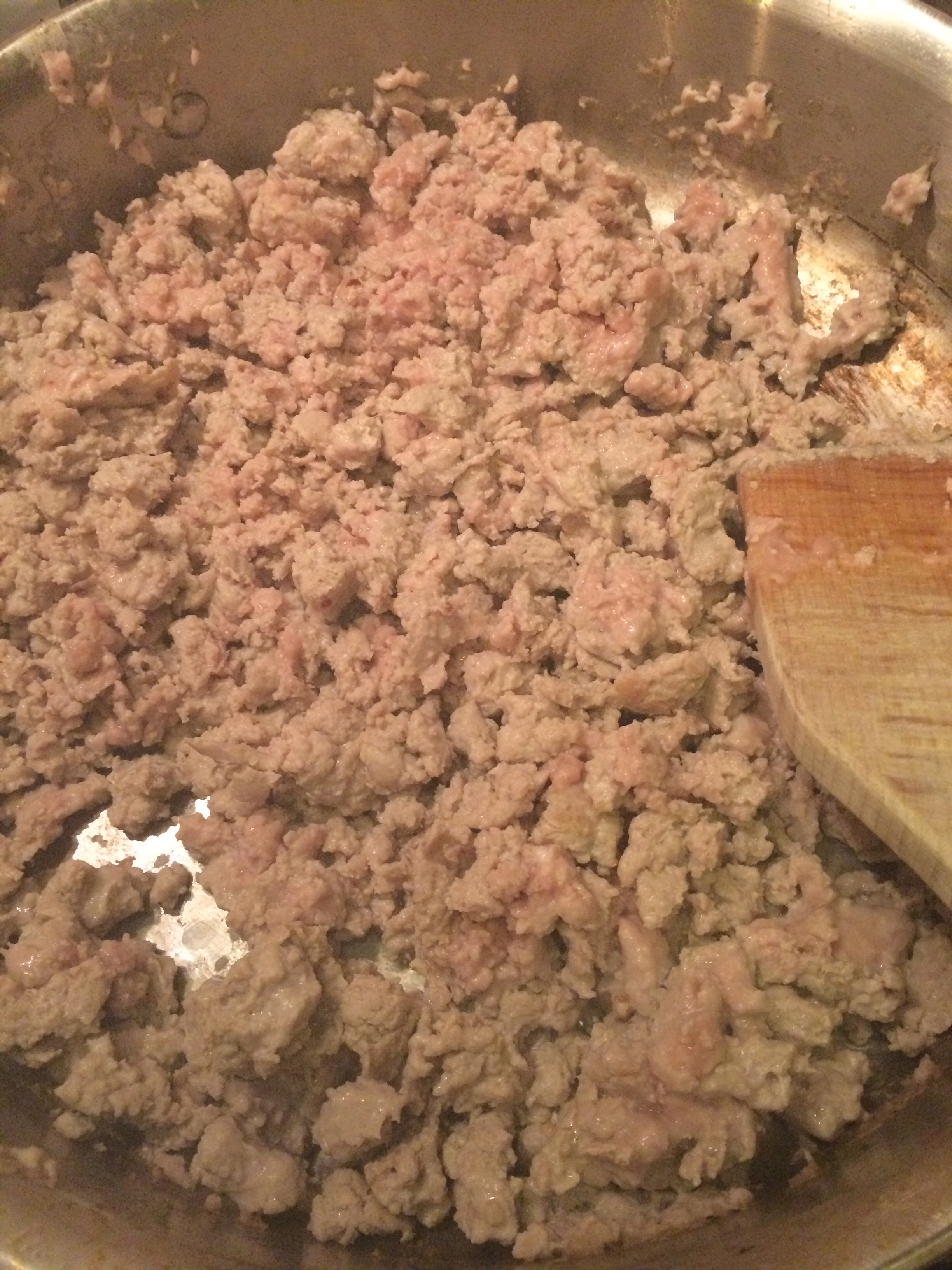 Because the pasta sauce has a lot of salt and spices, you don’t need to season the meat at this point in time. Using a flat ended spatula, break the meat up. Make sure your stove is on medium-high.