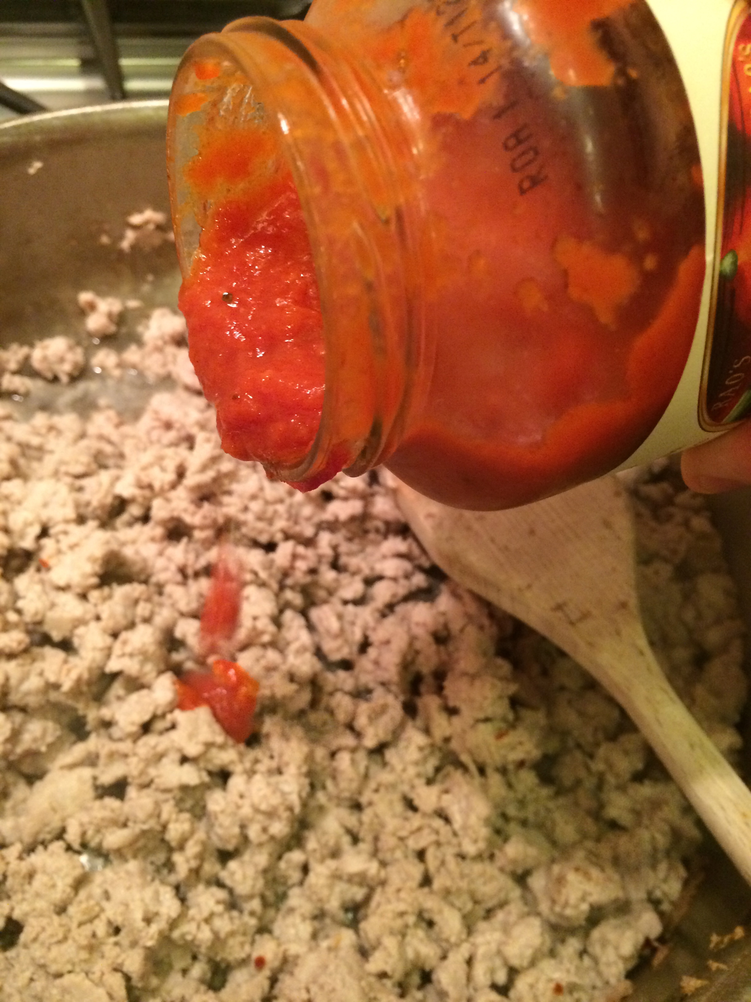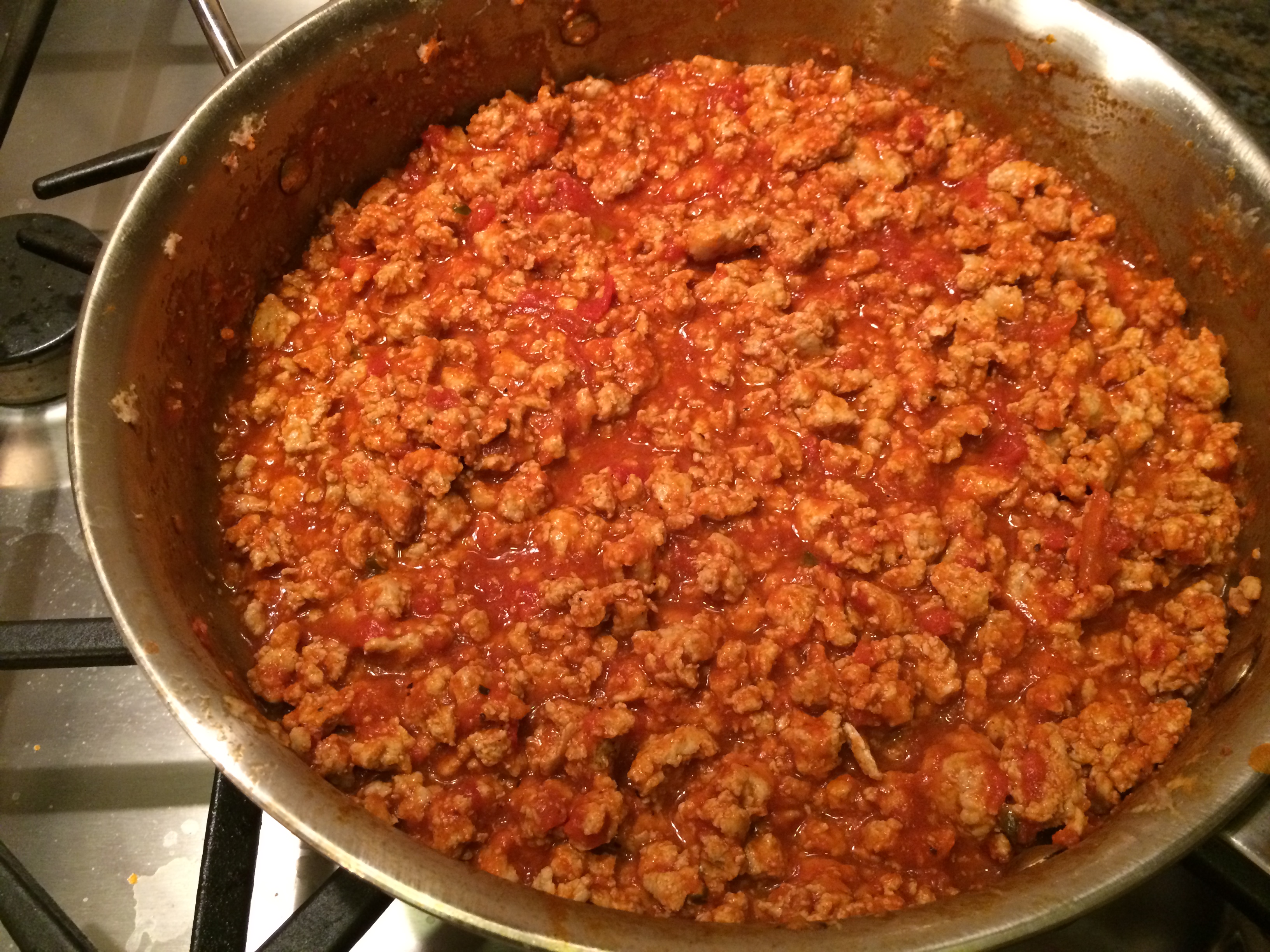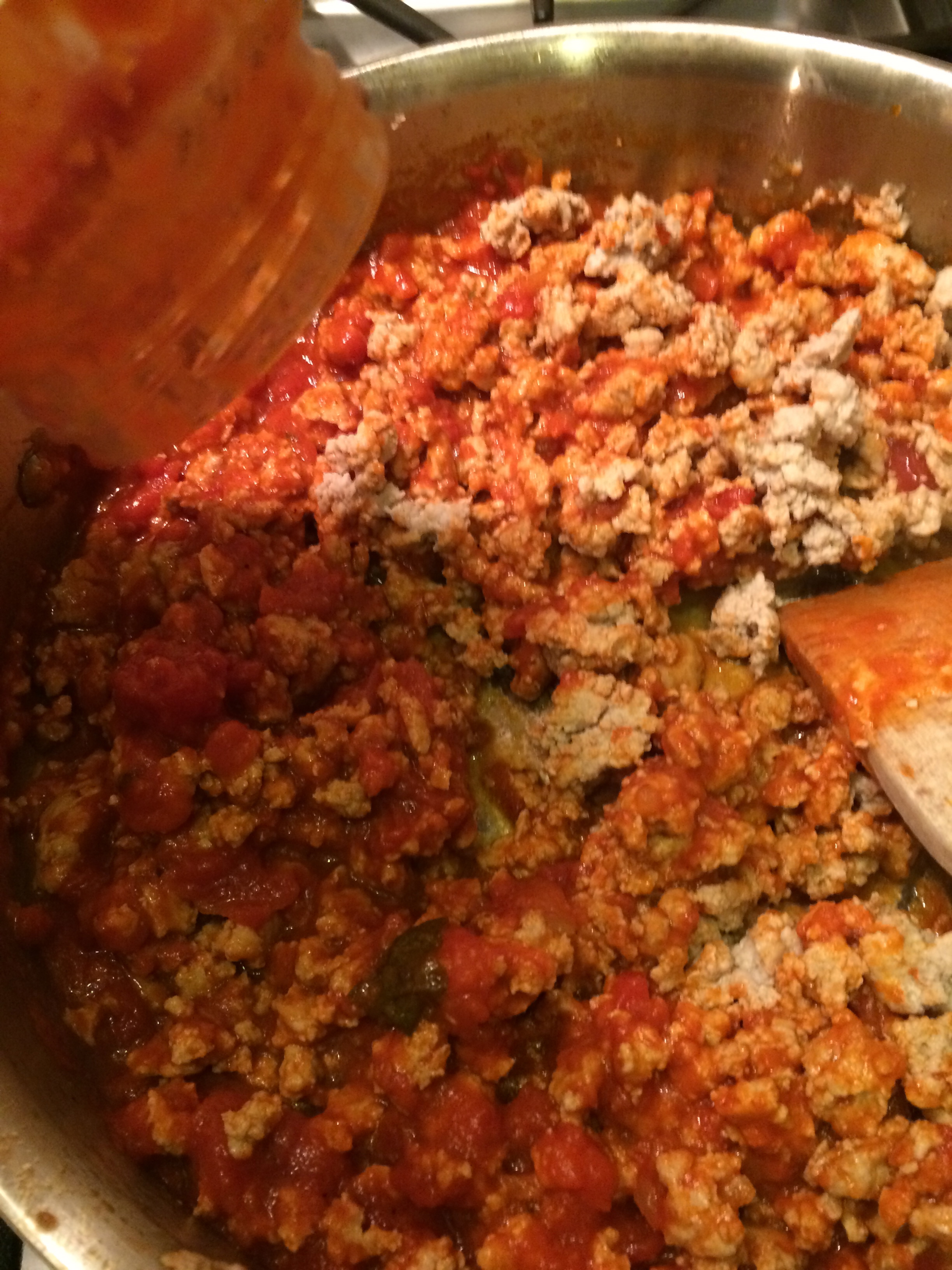 Once the meat is browned, add the sauce, bring to a boil, and turn the heat down to simmer.