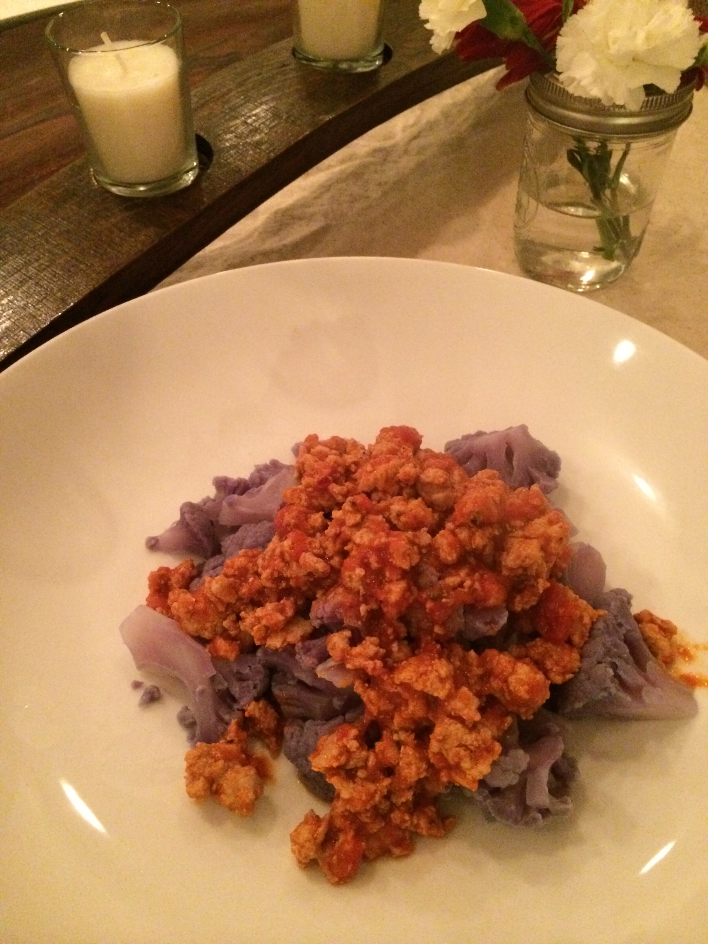 When you’re ready to eat, ladle the cauliflower onto a plate and top with sauce. Enjoy your “pasta”!