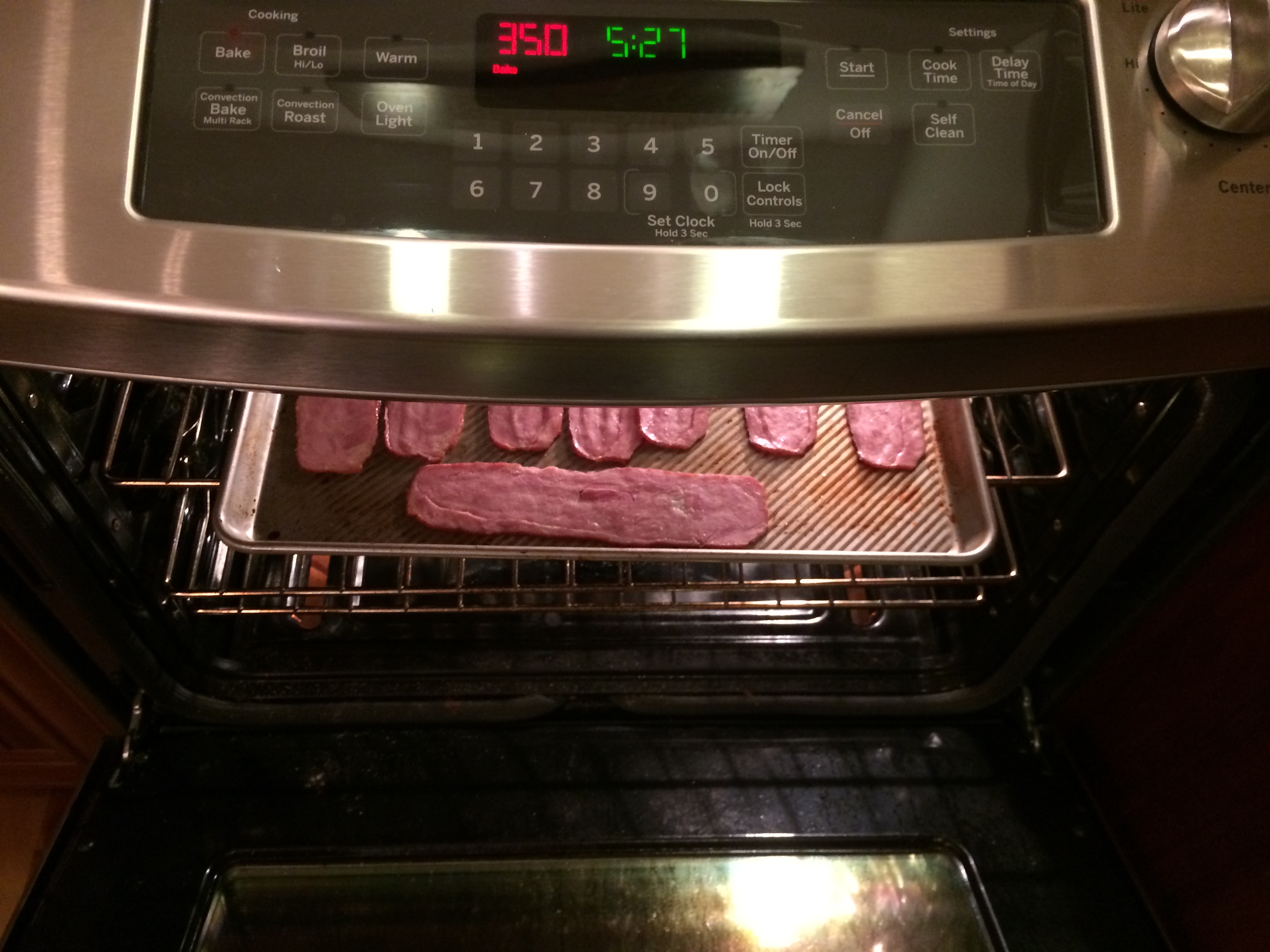 Place the turkey bacon in the oven and bake for fifteen minutes.