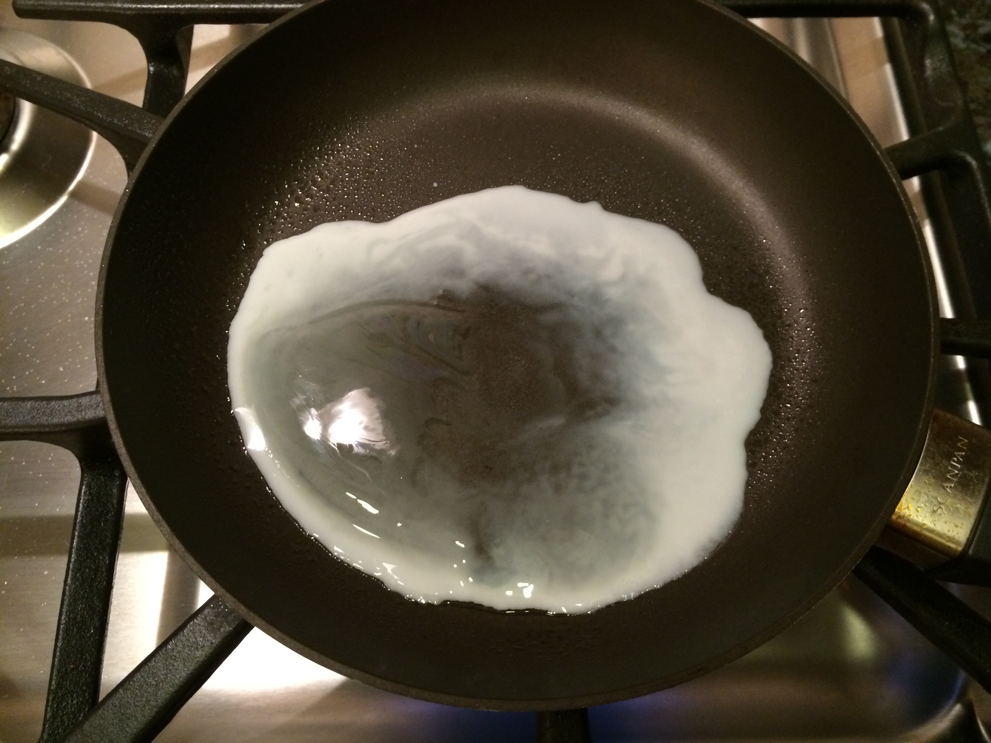 After the oil is hot, crack your egg on the side of the pan (no need to dirty a dish!). Using the shells as cups, transfer the yolk from one shell to the other, allowing the egg white to splash onto the pan. Discard the egg yolk.