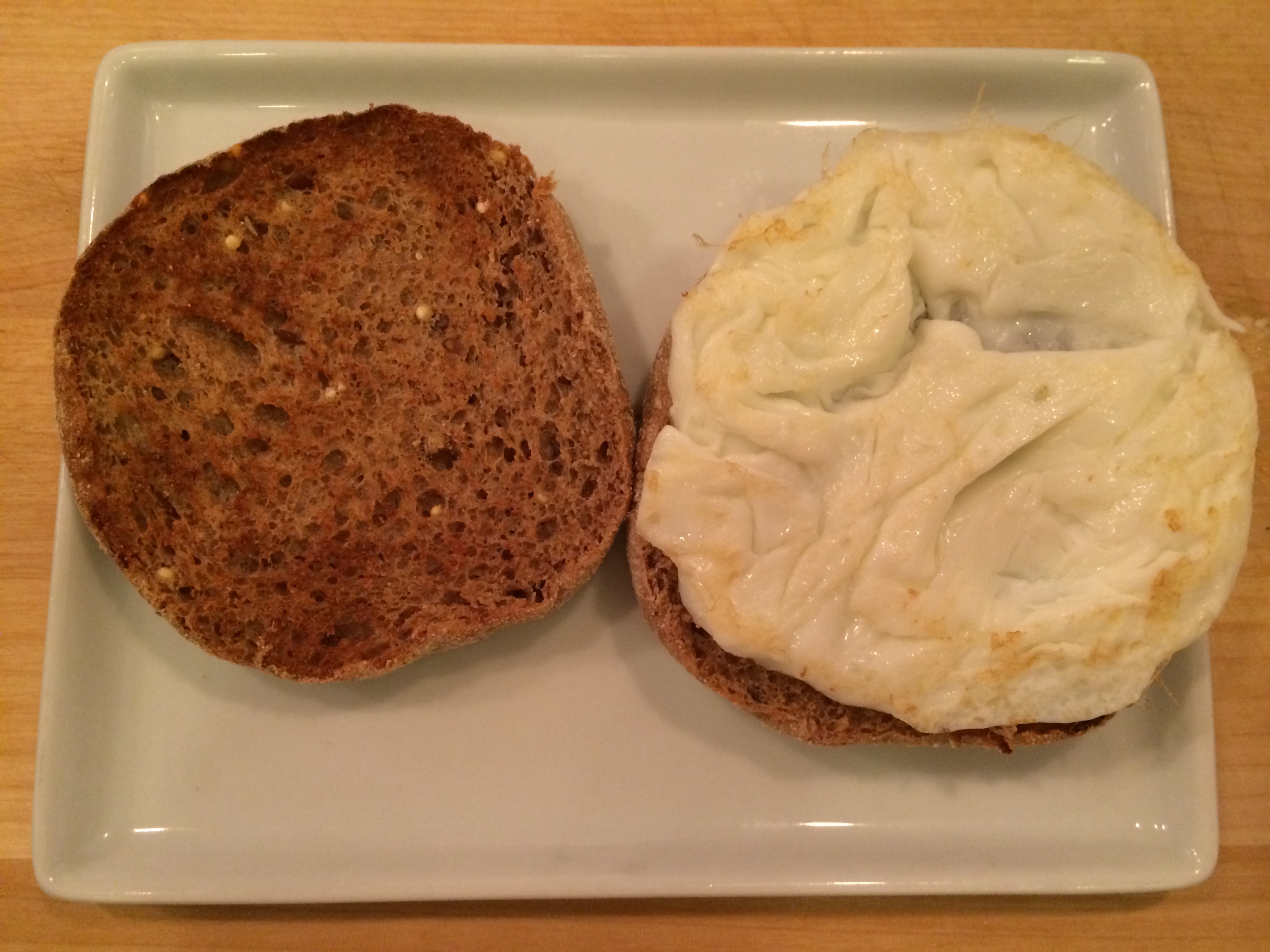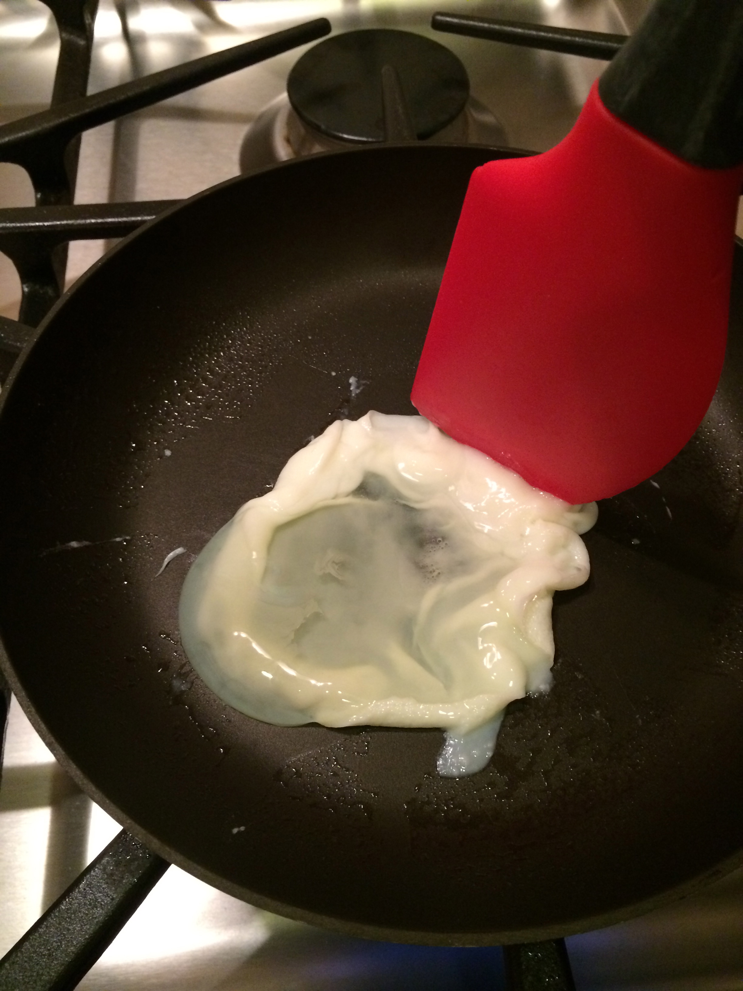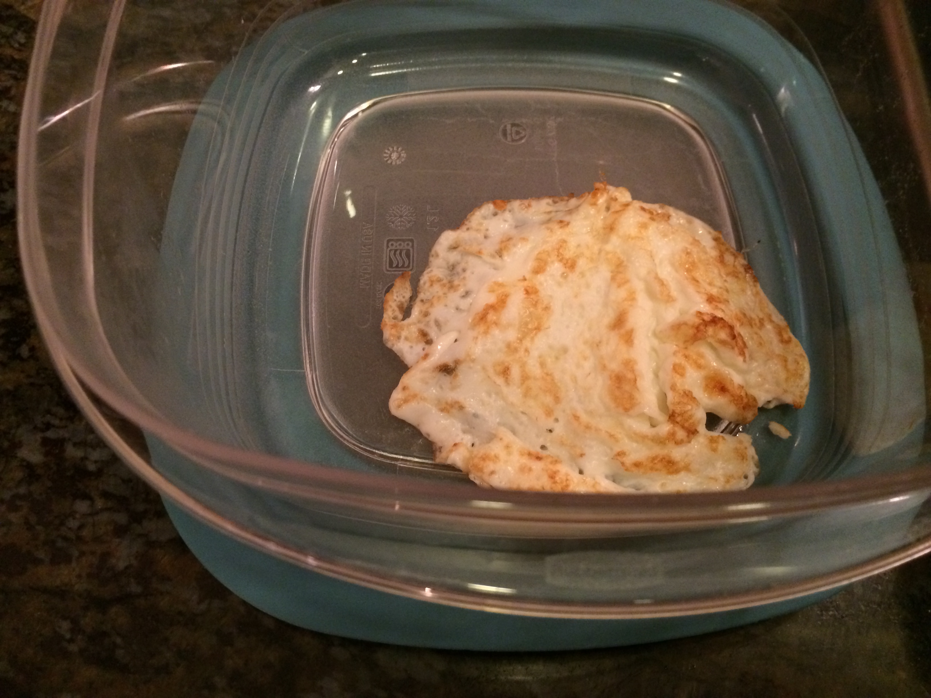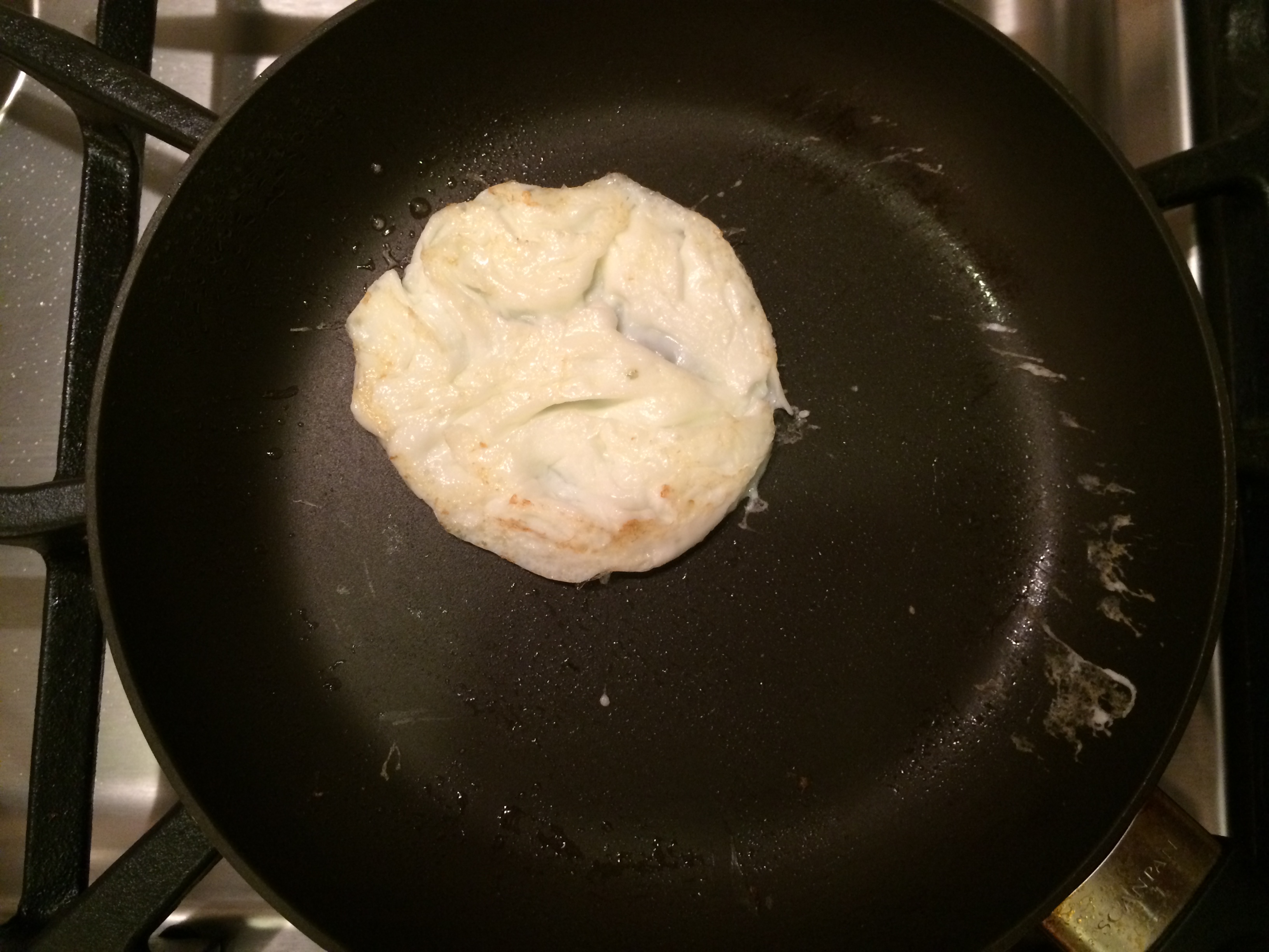 Depending on how how your pan is, your egg white will finish cooking in the next thirty seconds to two minutes. When the egg is “white” and no longer transparent, it’s cooked. Transfer to a tupperware: