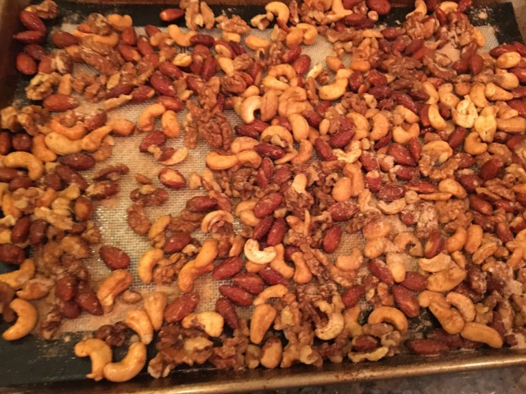 Sprinkle over the nuts (tip if you are not used to sprinkling sugar mixtures over nuts – the higher your hand is, the more evenly it distributes). Toss and coat both sides. Arrange in a single layer on the baking sheet.